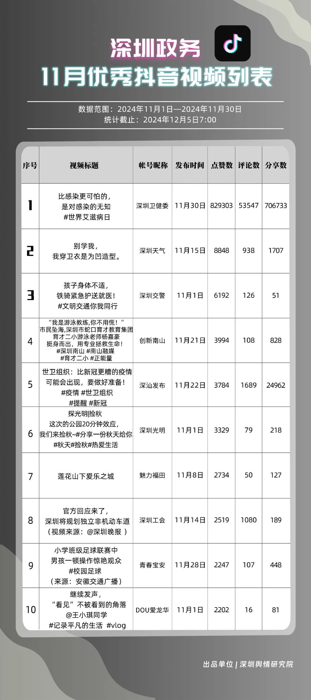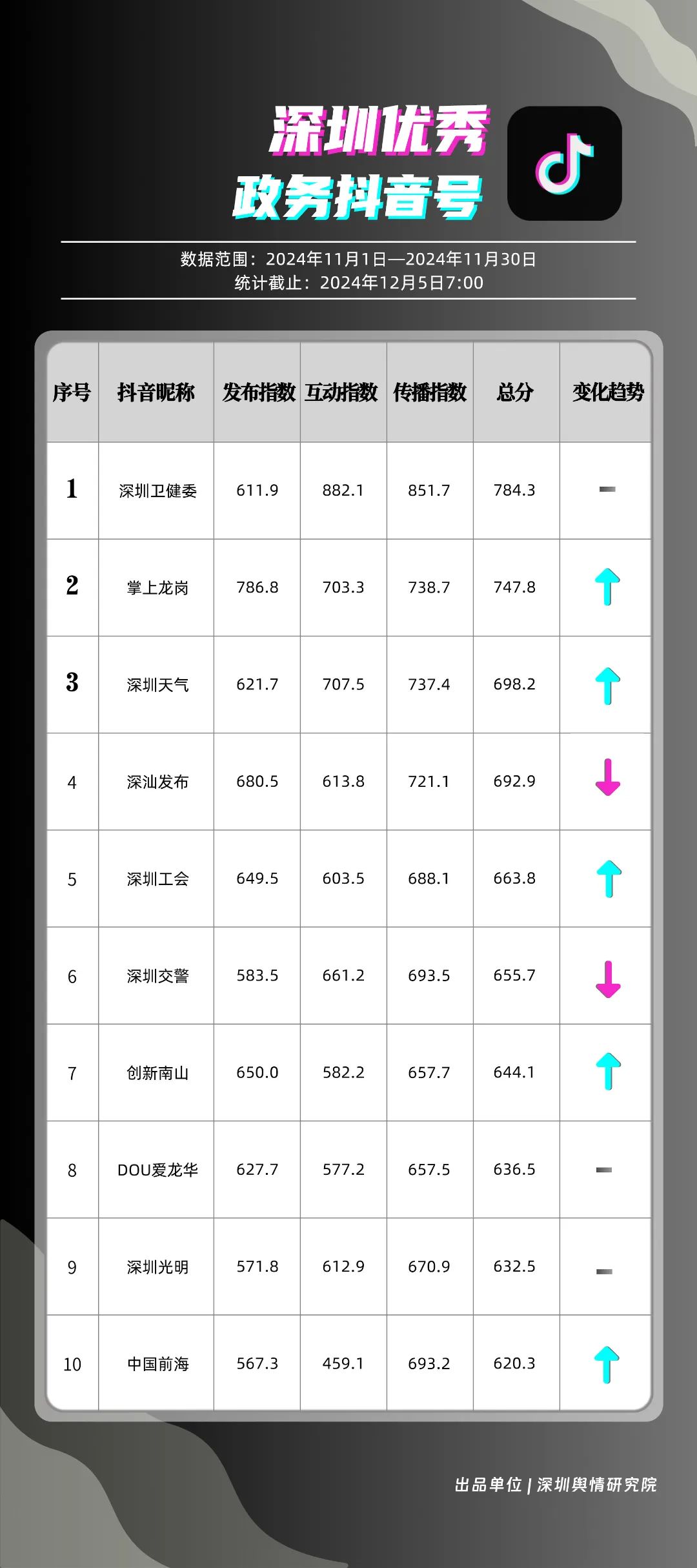 11月,“深圳衛(wèi)健委”“掌上龍崗”“深圳天氣”“深汕發(fā)布”“深圳工會(huì)”“深圳交警”“創(chuàng)新南山”“DOU愛(ài)龍華”“深圳光明”“中國(guó)前海”共10個(gè)政務(wù)抖音號(hào)獲得“深圳優(yōu)秀政務(wù)抖音號(hào)”稱(chēng)號(hào)?!吧钲谛l(wèi)健委”憑借高質(zhì)量劇情內(nèi)容,巧妙融入健康知識(shí),視頻累計(jì)收獲近百萬(wàn)點(diǎn)贊。同時(shí),“掌上龍崗”和“深圳天氣”也在視頻內(nèi)容創(chuàng)新上不斷探索,通過(guò)優(yōu)化宣傳策略和信息傳播方式,使得網(wǎng)民能夠在輕松愉快的氛圍中了解龍崗區(qū)的最新動(dòng)態(tài)和深圳的天氣信息,展現(xiàn)了政務(wù)抖音號(hào)的獨(dú)特魅力與社會(huì)影響力。