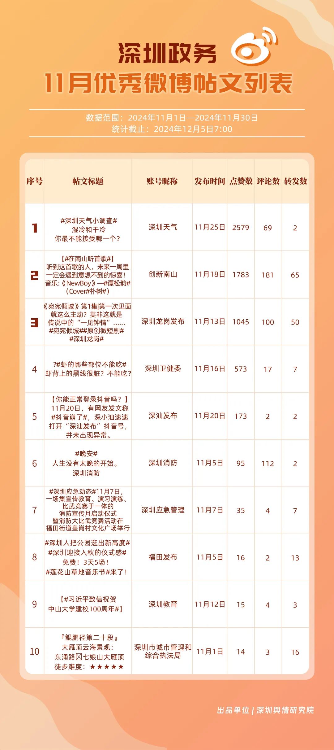 11月,“深圳天氣”“深圳衛(wèi)健委”“深圳龍崗發(fā)布”“深圳消防”“創(chuàng)新南山”“深圳應(yīng)急管理”“深圳公安”“深圳市城市管理和綜合執(zhí)法局”“福田發(fā)布”“深圳交警”等20個(gè)賬號(hào)入選“優(yōu)秀政務(wù)微博號(hào)”?!吧钲谔鞖狻薄吧钲谛l(wèi)健委”賬號(hào)在信息傳播上不斷精進(jìn),為市民帶來(lái)及時(shí)、優(yōu)質(zhì)且高效的資訊,內(nèi)容緊貼民生,贏得了市民的廣泛贊譽(yù),排名穩(wěn)定在前2名。同時(shí),“深圳龍崗發(fā)布”“深圳消防”和“創(chuàng)新南山”等賬號(hào)也能夠精準(zhǔn)滿(mǎn)足市民的信息需求,并在此基礎(chǔ)上提升市民閱讀體驗(yàn),推動(dòng)了其在榜單上的穩(wěn)步提升,彰顯了政務(wù)微博的創(chuàng)新活力與社會(huì)價(jià)值。
