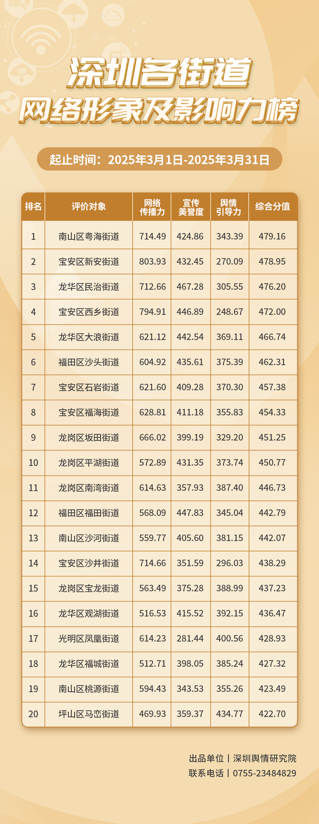 2025年3月,各街道緊扣網(wǎng)絡(luò)形象塑造的核心目標(biāo),精準(zhǔn)發(fā)力,不斷拓展基層宣傳的輻射廣度與影響深度?!渡钲诟鹘值谰W(wǎng)絡(luò)形象及影響力榜》(3月榜單)評(píng)估街道在網(wǎng)絡(luò)空間的綜合表現(xiàn),為基層網(wǎng)絡(luò)形象治理提供參考。本期榜單數(shù)據(jù)統(tǒng)計(jì)范圍為2025年3月1日至3月31日。