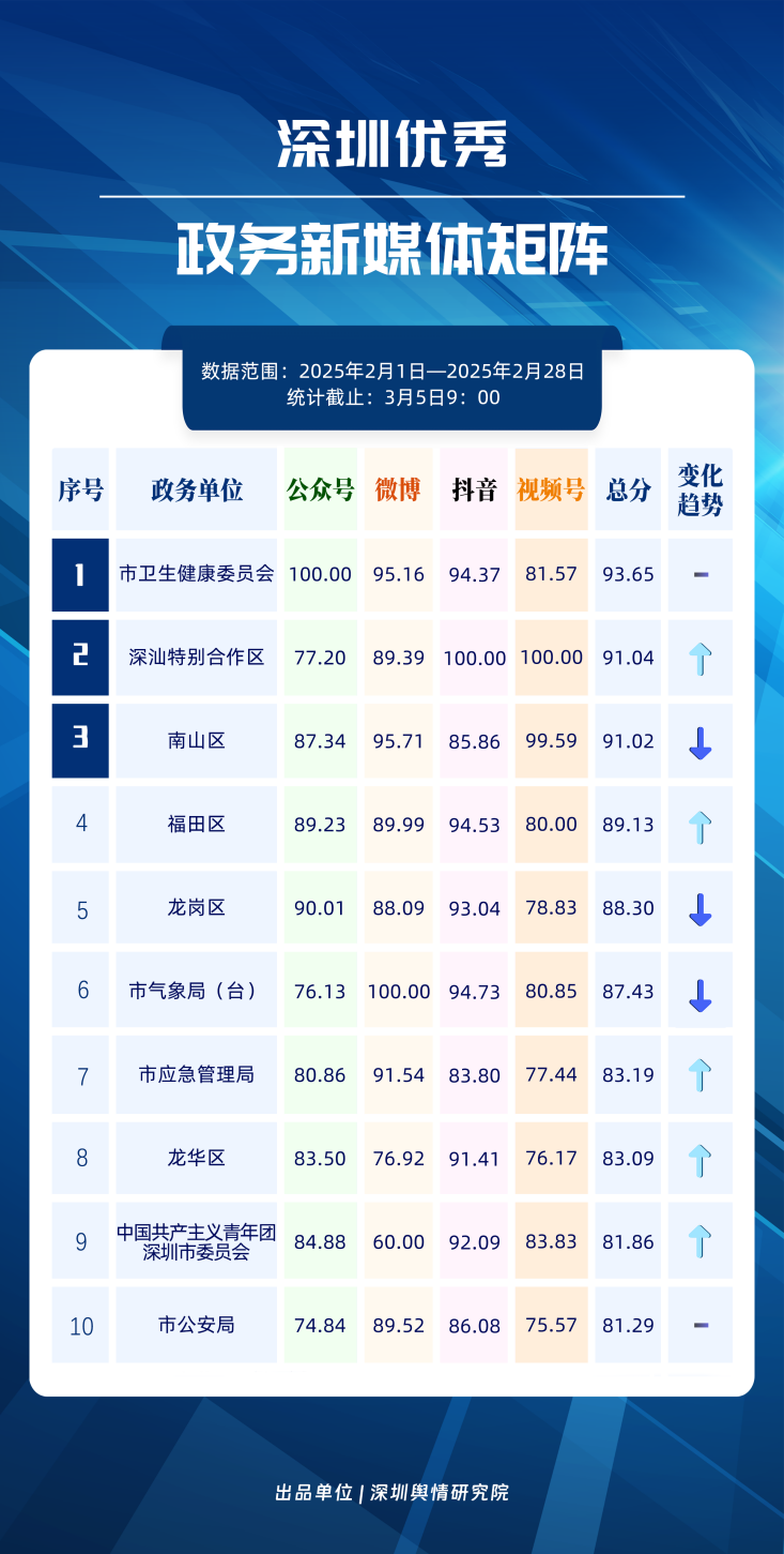 2025年2月期《深圳優(yōu)秀政務(wù)新媒體矩陣》發(fā)布,本期榜單框架有所優(yōu)化,公眾號(hào)、微博號(hào)、抖音號(hào)、視頻號(hào)得分在綜合計(jì)算時(shí)的權(quán)重調(diào)整為30%、20%、30%、20%。公眾號(hào)榜單中,根據(jù)閱讀量超10萬次的文章篇數(shù),在傳播指數(shù)額外加分,激勵(lì)優(yōu)質(zhì)內(nèi)容產(chǎn)出。接下來,讓我們一同揭曉,2月哪些矩陣成為政務(wù)信息傳播與服務(wù)創(chuàng)新標(biāo)桿,為政務(wù)新媒體矩陣創(chuàng)新發(fā)展樹立高質(zhì)量發(fā)展范式。