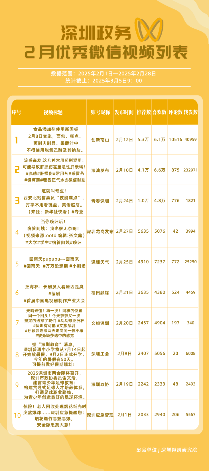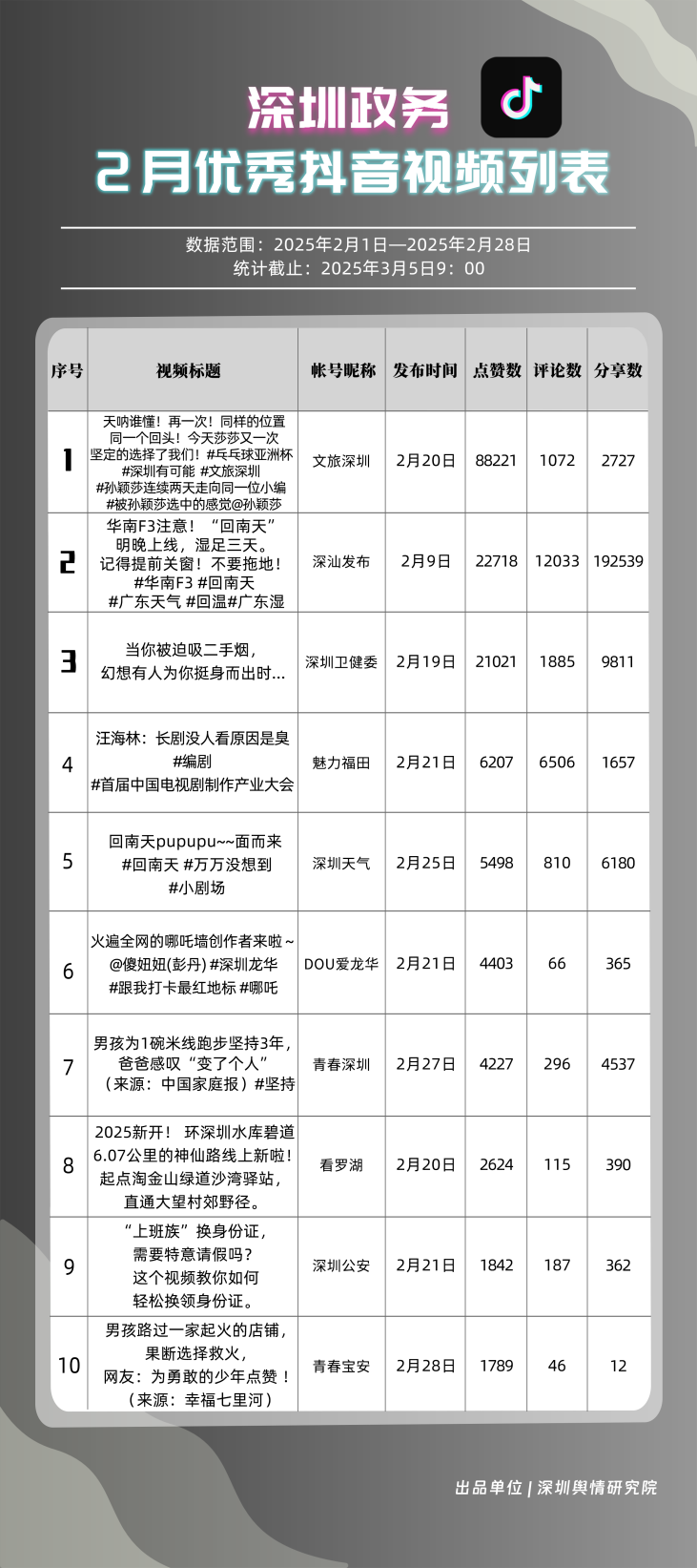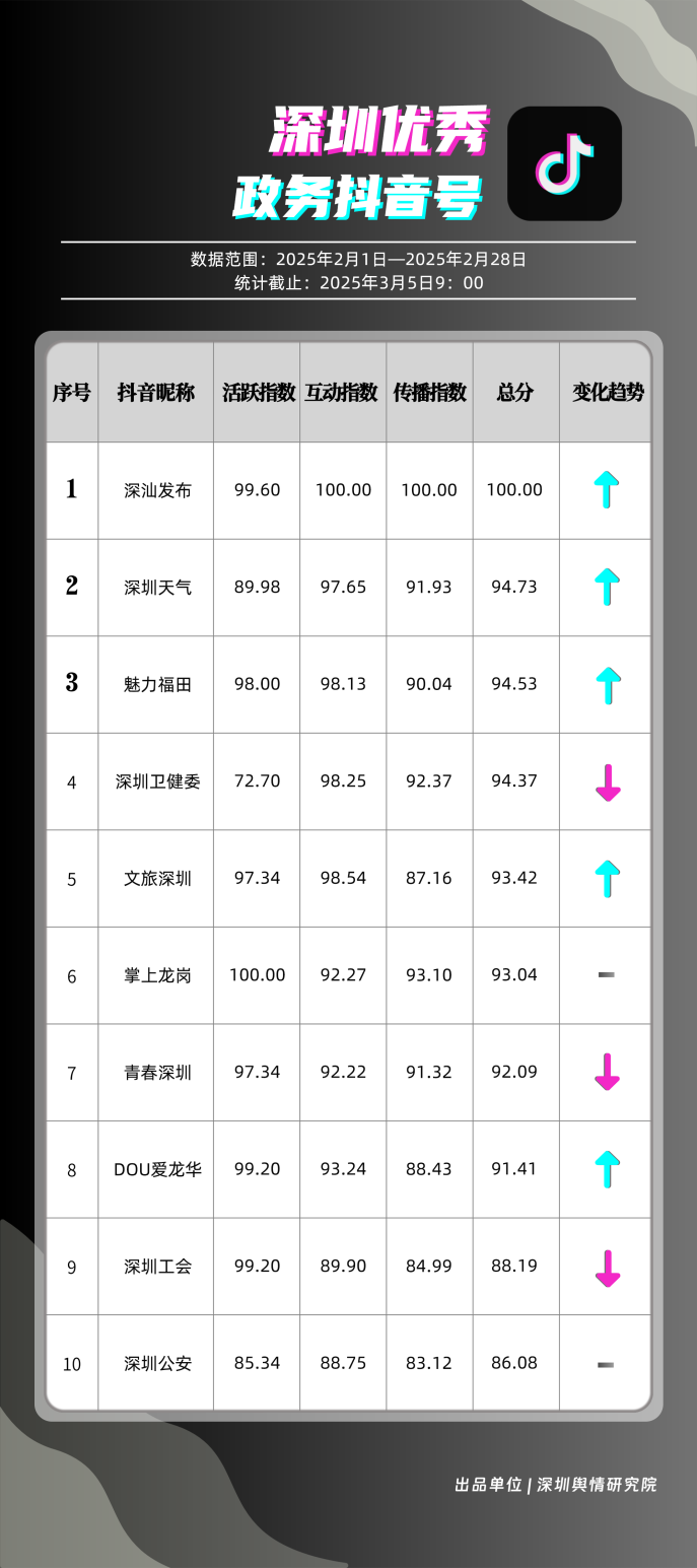 2月,“深汕發(fā)布”“深圳天氣”“魅力福田”“深圳衛(wèi)健委”“文旅深圳”“掌上龍崗”“青春深圳”“DOU愛龍華”“深圳工會(huì)”“深圳公安”共10個(gè)政務(wù)抖音號(hào)獲得“深圳優(yōu)秀政務(wù)抖音號(hào)”稱號(hào)。“深汕發(fā)布”位于榜單第一名,值得關(guān)注的是,該賬號(hào)2月作品總分享數(shù)超20萬次,其中有關(guān)“華南地區(qū)回南天”的視頻單條分享量達(dá)到19萬次以上,展現(xiàn)出強(qiáng)勁的傳播力?!吧钲谔鞖狻薄镑攘ΩL铩薄吧钲谛l(wèi)健委”三賬號(hào)堅(jiān)持輸出優(yōu)質(zhì)內(nèi)容,得分均在94分以上,展現(xiàn)出深圳政務(wù)新媒體賬號(hào)在短視頻傳播領(lǐng)域的創(chuàng)新活力。