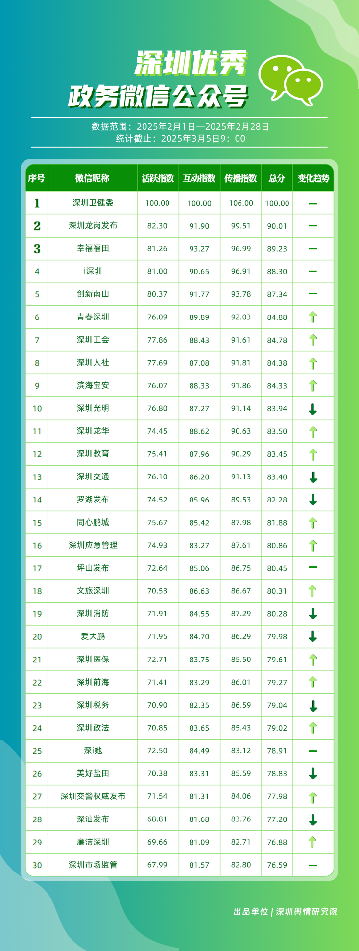 2月,“深圳衛(wèi)健委”“深圳龍崗發(fā)布”“幸福福田”“i深圳”“創(chuàng)新南山”“青春深圳”“深圳工會(huì)”“深圳人社”“濱海寶安”“深圳光明”等30個(gè)賬號(hào)入選“深圳優(yōu)秀政務(wù)微信公眾號(hào)”。其中,“深圳衛(wèi)健委”2月作品總閱讀數(shù)超600萬次,轉(zhuǎn)發(fā)超70萬次,穩(wěn)居榜單首位;“深圳龍崗發(fā)布”也在互動(dòng)、傳播方面取得較好成績(jī),位于榜單第二位;“幸福福田”活躍度有所提升,位于榜單第三名;緊隨其后的是“i深圳”“創(chuàng)新南山”,總分均在87分以上,展現(xiàn)出各自在新媒體生態(tài)中的強(qiáng)大傳播力與影響力。