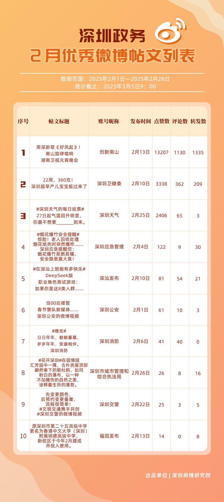 2月,“深圳天氣”“創(chuàng)新南山”“深圳衛(wèi)健委”“深圳消防”“深圳應(yīng)急管理”“福田發(fā)布”“深圳公安”“深汕發(fā)布”“深圳龍崗發(fā)布”“深圳交警”等20個(gè)賬號(hào)入選“優(yōu)秀政務(wù)微博號(hào)”。綜合看來,本月榜單前10名較上期變動(dòng)不大,反映出靠前賬號(hào)運(yùn)營發(fā)揮較穩(wěn)定。其中,“深圳天氣”在榜單中獲得第一名,該賬號(hào)與網(wǎng)民互動(dòng)積極,2月作品總點(diǎn)贊數(shù)超8萬次;“創(chuàng)新南山”“深圳衛(wèi)健委”“深圳消防”“深圳應(yīng)急管理”也各有所長(zhǎng),排名靠前,展現(xiàn)出深圳政務(wù)微博在形象塑造、民生服務(wù)、應(yīng)急科普等領(lǐng)域的持續(xù)影響力。