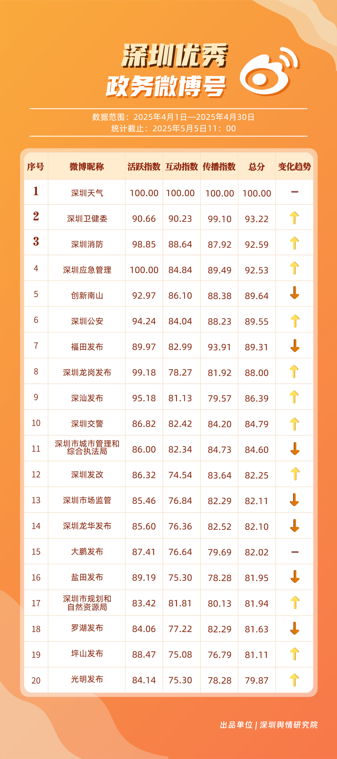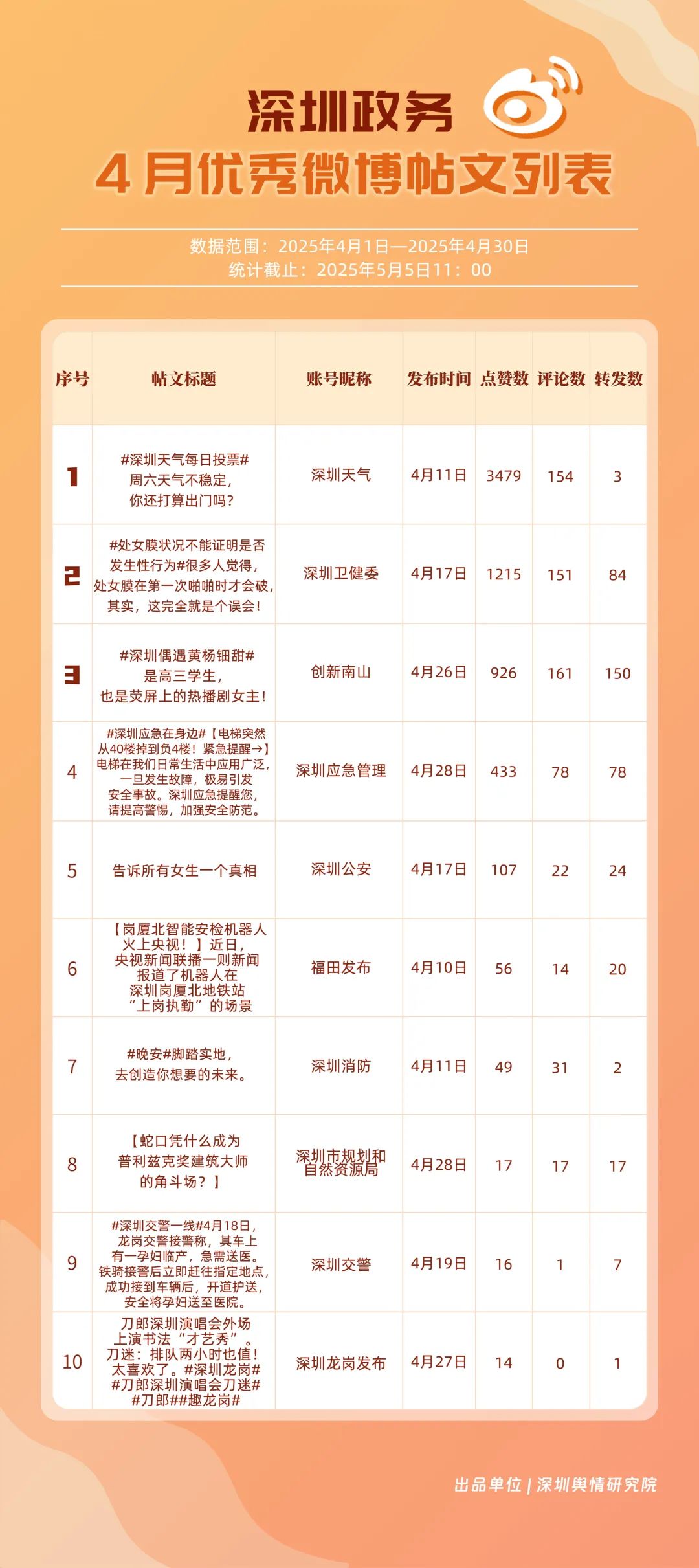 4月,“深圳天氣”“深圳衛(wèi)健委”“深圳消防”“深圳應急管理”“創(chuàng)新南山”“深圳公安”“福田發(fā)布”“深圳龍崗發(fā)布”“深汕發(fā)布”“深圳交警”等20個賬號入選“優(yōu)秀政務微博號”。值得一提的是,“深圳天氣”在多個指標中獲得滿分,其氣象信息的趣味性和實用性受到市民認可;“深圳衛(wèi)健委”“深圳消防”“深圳應急管理”也在信息傳播、互動服務等方面持續(xù)發(fā)力,以超過90分的總分緊跟其后;“深汕發(fā)布”“深圳交警”相較于3月在榜單排名有所提升,展現(xiàn)出強勁的發(fā)展勢頭。這些優(yōu)秀政務微博號的脫穎而出,不僅體現(xiàn)了各自的運營實力,更反映出深圳政務新媒體在微博平臺的蓬勃發(fā)展態(tài)勢。