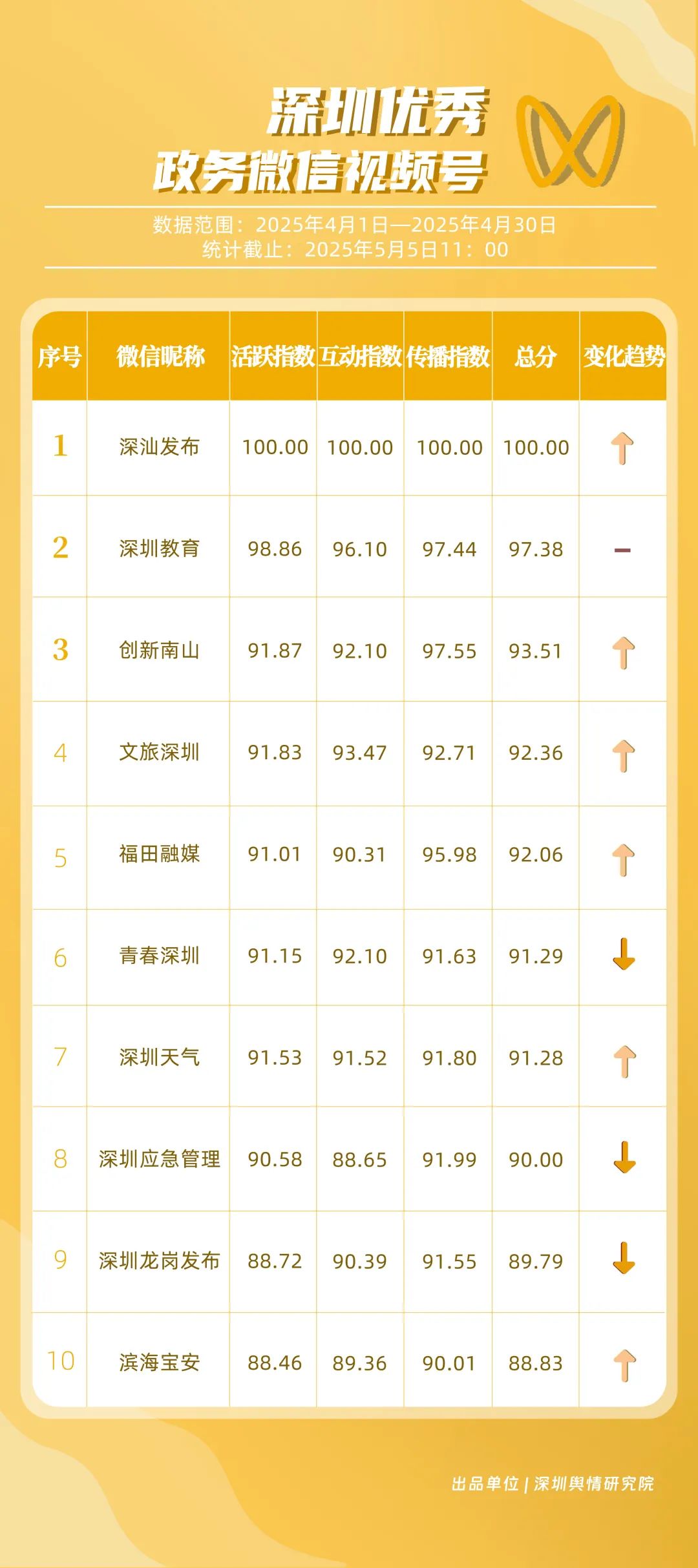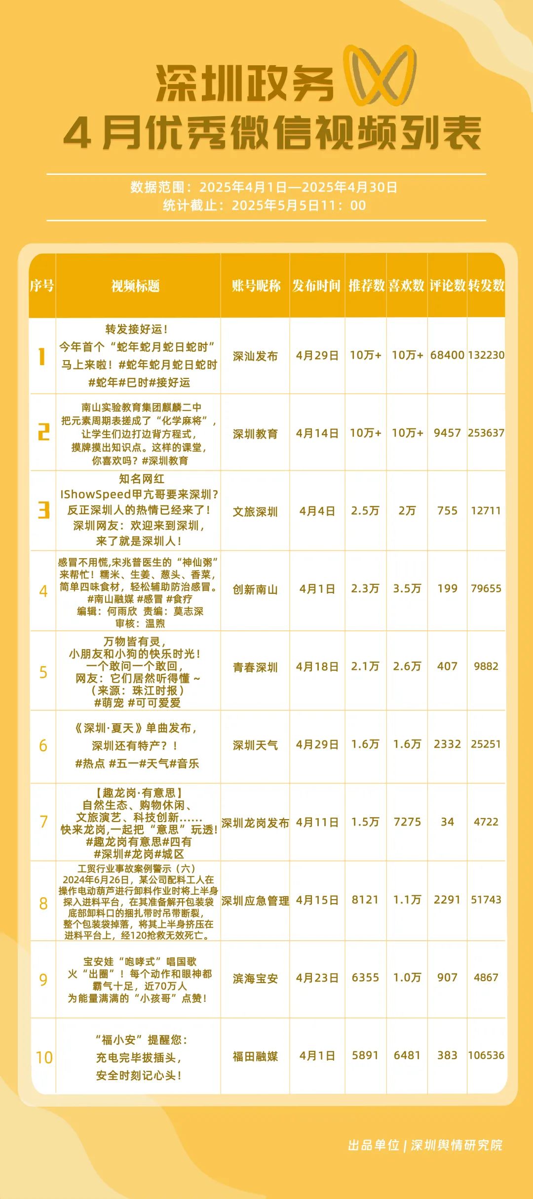 4月,獲“深圳優(yōu)秀政務微信視頻號”稱號的是“深汕發(fā)布”“深圳教育”“創(chuàng)新南山”“文旅深圳”“福田融媒”“青春深圳”“深圳天氣”“深圳應急管理”“深圳龍崗發(fā)布”“濱海寶安”。其中,“深汕發(fā)布”憑借亮眼的數(shù)據(jù)表現(xiàn)成為榜首,其一條有關(guān)“蛇年蛇月蛇日蛇時”的視頻作品點贊量超10萬次、評論量超6.8萬次,轉(zhuǎn)發(fā)量超13萬次;“深圳教育”持續(xù)穩(wěn)定輸出優(yōu)質(zhì)內(nèi)容,以扎實的運營實力鞏固自身影響力,位居榜單第2位;“創(chuàng)新南山”“文旅深圳”“福田融媒”分別位列榜單第3、4、5位,總分超92分,在區(qū)域形象宣傳、文旅資源推廣等方面展現(xiàn)出卓越的傳播效能,成為傳遞區(qū)域特色與發(fā)展動態(tài)的重要窗口。