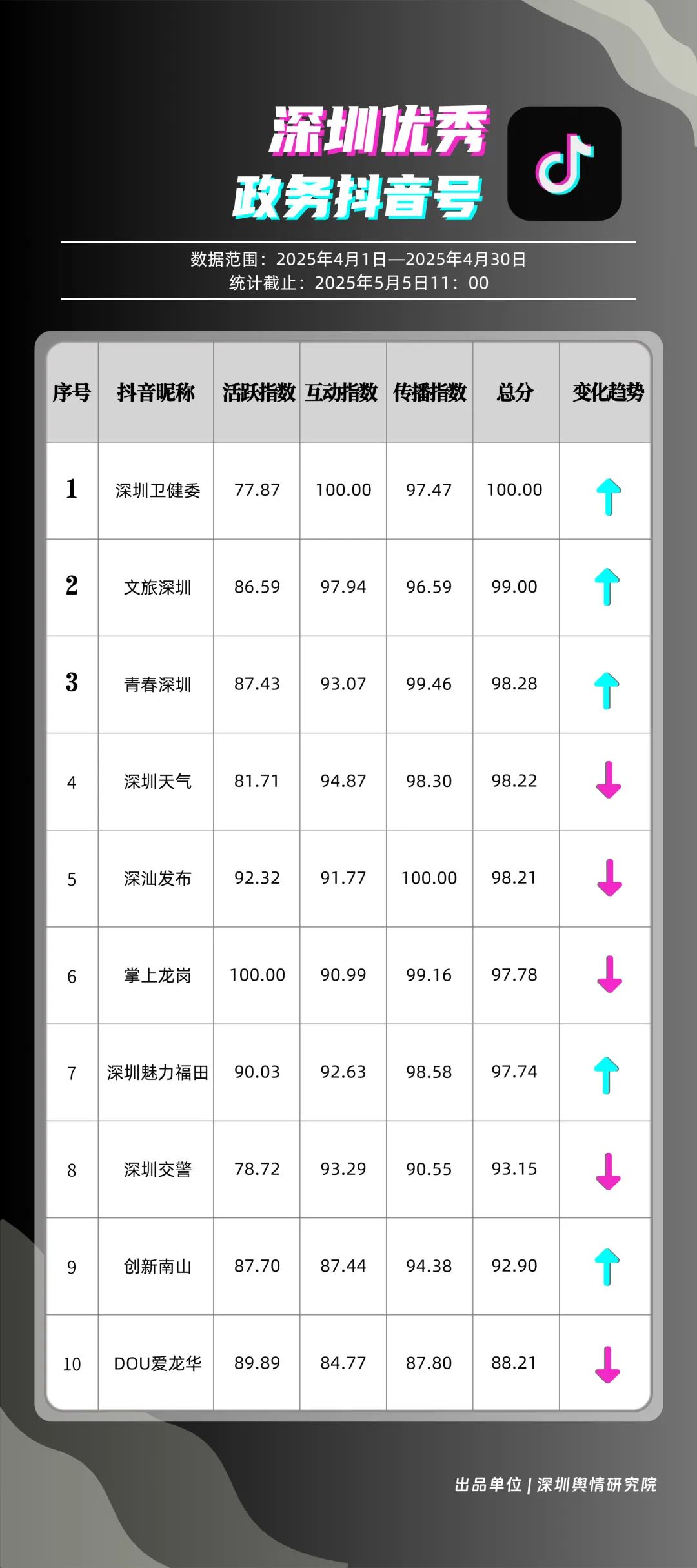 4月,“深圳衛(wèi)健委”“文旅深圳”“青春深圳”“深圳天氣”“深汕發(fā)布”“掌上龍崗”“深圳魅力福田”“深圳交警”“創(chuàng)新南山”“DOU愛龍華”共10個政務抖音號獲得“優(yōu)秀政務抖音號”稱號。4月,“深圳衛(wèi)健委”“文旅深圳”“青春深圳”憑借新穎的內(nèi)容策劃、生動的短視頻呈現(xiàn)方式,實現(xiàn)排名提升,位居榜單前三?!吧钲谔鞖狻薄吧钌前l(fā)布”緊隨其后,以優(yōu)質(zhì)實用的內(nèi)容、接地氣的表達,持續(xù)擴大政務新媒體的傳播聲量。上榜賬號積極探索創(chuàng)新傳播路徑,以生動有趣的方式傳遞政務信息,為深圳政務新媒體在短視頻領(lǐng)域的發(fā)展注入新活力。