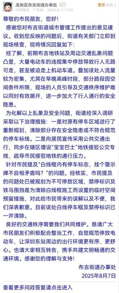 良好的交通秩序需要我們共同維護(hù)。懇請(qǐng)廣大市民朋友們積極配合整治工作,自覺規(guī)范停放電動(dòng)車,讓深圳東站周邊的出行環(huán)境更有序、更舒心。也請(qǐng)大家相互轉(zhuǎn)告,攜手共建文明暢通的交通環(huán)境。感謝您的理解與支持!