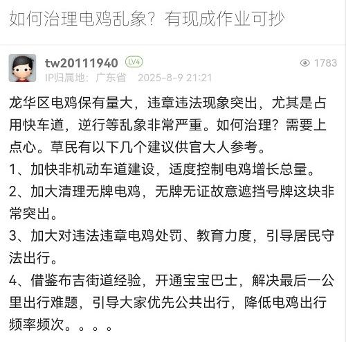 感謝您的反饋。龍華區(qū)作為深圳市的中軸新城,產(chǎn)業(yè)密集、人口居住集中,轄區(qū)電動(dòng)自行車保有量同樣呈快速增長狀態(tài),目前龍華區(qū)的非機(jī)動(dòng)車占全市總量約五分之一。一直以來,深圳市公安局交通管理局龍華大隊(duì)高度重視電動(dòng)自行車安全管理工作,從通行管理、秩序整治、隱患治理、宣傳教育四大方面綜合施策,不斷優(yōu)化治理策略,切實(shí)提升電動(dòng)自行車交通管理水平。您的建議我們也會(huì)向相關(guān)部門反饋,共同努力治理電動(dòng)車。再次感謝您對(duì)交通管理工作的支持和理解!