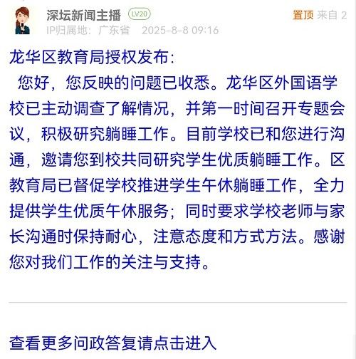 您好,您反映的問題已收悉。龍華區(qū)外國語學(xué)校已主動(dòng)調(diào)查了解情況,并第一時(shí)間召開專題會(huì)議,積極研究躺睡工作。目前學(xué)校已和您進(jìn)行溝通,邀請(qǐng)您到校共同研究學(xué)生優(yōu)質(zhì)躺睡工作。區(qū)教育局已督促學(xué)校推進(jìn)學(xué)生午休躺睡工作,全力提供學(xué)生優(yōu)質(zhì)午休服務(wù);同時(shí)要求學(xué)校老師與家長溝通時(shí)保持耐心,注意態(tài)度和方式方法。感謝您對(duì)我們工作的關(guān)注與支持。