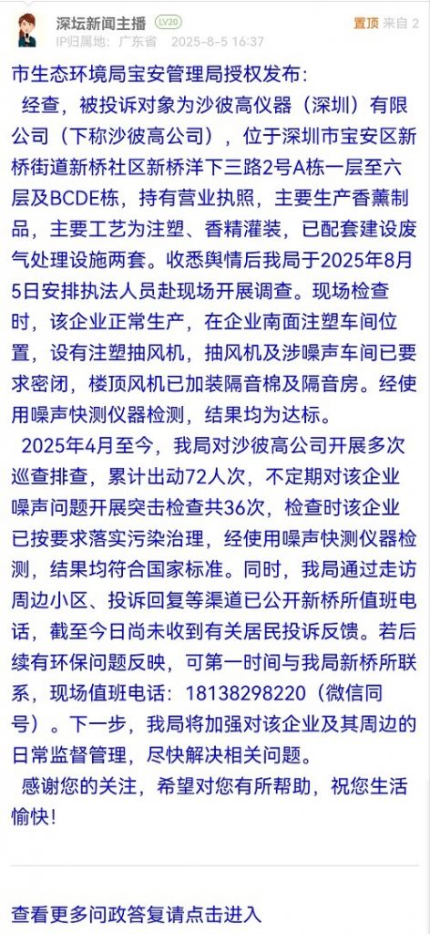 經(jīng)查,被投訴對(duì)象為沙彼高儀器(深圳)有限公司(下稱沙彼高公司),位于深圳市寶安區(qū)新橋街道新橋社區(qū)新橋洋下三路2號(hào)A棟一層至六層及BCDE棟,持有營業(yè)執(zhí)照,主要生產(chǎn)香薰制品,主要工藝為注塑、香精灌裝,已配套建設(shè)廢氣處理設(shè)施兩套。收悉輿情后我局于2025年8月5日安排執(zhí)法人員赴現(xiàn)場(chǎng)開展調(diào)查?,F(xiàn)場(chǎng)檢查時(shí),該企業(yè)正常生產(chǎn),在企業(yè)南面注塑車間位置,設(shè)有注塑抽風(fēng)機(jī),抽風(fēng)機(jī)及涉噪聲車間已要求密閉,樓頂風(fēng)機(jī)已加裝隔音棉及隔音房。經(jīng)使用噪聲快測(cè)儀器檢測(cè),結(jié)果均為達(dá)標(biāo)。