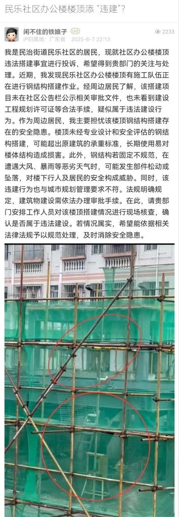 19. 帖文《民樂社區(qū)辦公樓樓頂添 “違建”?》
