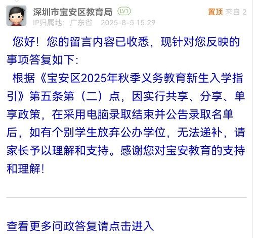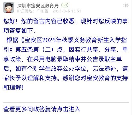 根據(jù)《寶安區(qū)2025年秋季義務(wù)教育新生入學(xué)指引》第五條第(二)點(diǎn),因?qū)嵭泄蚕怼⒎窒?、單享政策,在采用電腦錄取結(jié)束并公告錄取名單后,如有個(gè)別學(xué)生放棄公辦學(xué)位,無法遞補(bǔ),請(qǐng)家長予以理解和支持。感謝您對(duì)寶安教育的支持和理解!