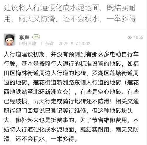 網(wǎng)友,您好!近年來,我們已對(duì)轄區(qū)內(nèi)部分電動(dòng)自行車通行量較大的道路,試點(diǎn)采用拉絲混凝土工藝進(jìn)行維修改造。下一步將結(jié)合年度養(yǎng)護(hù)計(jì)劃逐步推廣建設(shè)。感謝您的寶貴建議!