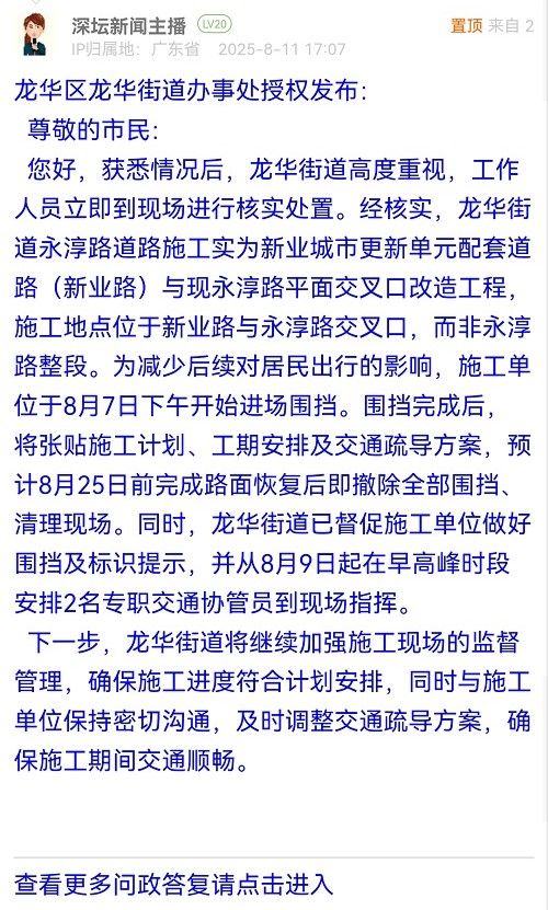 20. 帖文《龍華永淳路半幅道路被封無疏導(dǎo)》