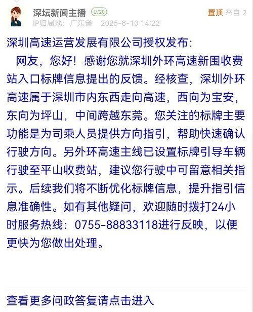 網(wǎng)友,您好!感謝您就深圳外環(huán)高速新圍收費(fèi)站入口標(biāo)牌信息提出的反饋。經(jīng)核查,深圳外環(huán)高速屬于深圳市內(nèi)東西走向高速,西向?yàn)閷毎玻瑬|向?yàn)槠荷?,中間跨越東莞。您關(guān)注的標(biāo)牌主要功能是為司乘人員提供方向指引,幫助快速確認(rèn)行駛方向。另外環(huán)高速主線已設(shè)置標(biāo)牌引導(dǎo)車輛行駛至平山收費(fèi)站,建議您行駛中可留意相關(guān)指示。后續(xù)我們將不斷優(yōu)化標(biāo)牌信息,提升指引信息準(zhǔn)確性。如有其他疑問,歡迎隨時(shí)撥打24小時(shí)服務(wù)熱線:0755-88833118進(jìn)行反映,以便更快為您做出處理。