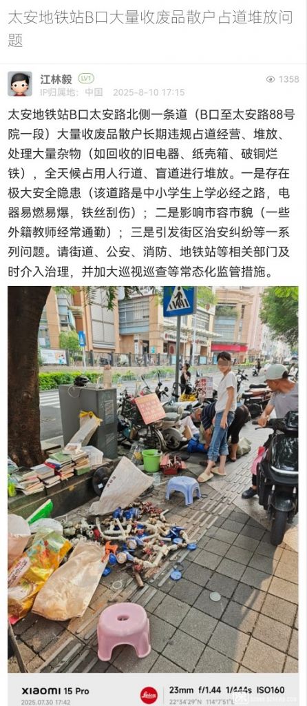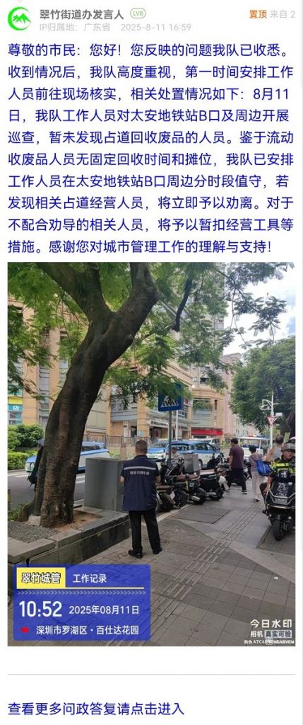 尊敬的市民:您好!您反映的問題我隊(duì)已收悉。收到情況后,我隊(duì)高度重視,第一時(shí)間安排工作人員前往現(xiàn)場(chǎng)核實(shí),相關(guān)處置情況如下:8月11日,我隊(duì)工作人員對(duì)太安地鐵站B口及周邊開展巡查,暫未發(fā)現(xiàn)占道回收廢品的人員。鑒于流動(dòng)收廢品人員無固定回收時(shí)間和攤位,我隊(duì)已安排工作人員在太安地鐵站B口周邊分時(shí)段值守,若發(fā)現(xiàn)相關(guān)占道經(jīng)營人員,將立即予以勸離。對(duì)于不配合勸導(dǎo)的相關(guān)人員,將予以暫扣經(jīng)營工具等措施。感謝您對(duì)城市管理工作的理解與支持!