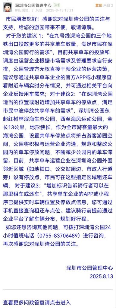 對(duì)于您的建議 1:“在九號(hào)線深灣公園的三個(gè)地鐵出口投放更多的共享單車數(shù)量,滿足市民在深圳灣公園騎行的需求”,目前共享單車的投放和調(diào)度由運(yùn)營企業(yè)根據(jù)市場(chǎng)需求及管理要求自行安排,公園管理方無權(quán)直接干預(yù)企業(yè)的運(yùn)營決策。建議您通過共享單車企業(yè)的官方APP或小程序查看附近車輛實(shí)時(shí)分布情況,并可通過相關(guān)平臺(tái)向企業(yè)反饋用車需求;對(duì)于建議2:“在深圳灣公園適當(dāng)?shù)奈恢没蚋浇黾庸蚕韱诬嚨耐7劈c(diǎn),滿足市民中途停放共享單車的需求”,深圳灣公園東起紅樹林濱海生態(tài)公園,西至海風(fēng)運(yùn)動(dòng)公園,全長13公里,地形狹長,作為全市游客量最大的海灣公園,設(shè)置共單車停放點(diǎn)將擠占游客游園空間,公園將積極與運(yùn)營企業(yè)溝通,規(guī)范和整改公園內(nèi)的單車停放問題,不斷減少公園內(nèi)的單車滯留。目前,共享單車運(yùn)營企業(yè)在深圳灣公園外圍鄰近區(qū)域(如地鐵口、公交站周邊、市政人行道旁)設(shè)有停放點(diǎn),市民可在這些指定區(qū)域租還車輛; 對(duì)于建議3:“增加標(biāo)識(shí)告訴騎行者可以在那里租車或還車”,共享單車企業(yè)的APP或小程序已提供實(shí)時(shí)車輛位置及停放點(diǎn)信息,您可通過手機(jī)直接查詢租還車點(diǎn)位。建議騎行前提前通過企業(yè)平臺(tái)了解車輛分布,規(guī)劃好行程。