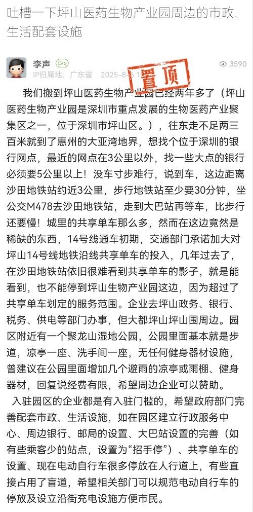 10. 帖文《吐槽一下坪山醫(yī)藥生物產(chǎn)業(yè)園周邊的市政、生活配套設(shè)施》