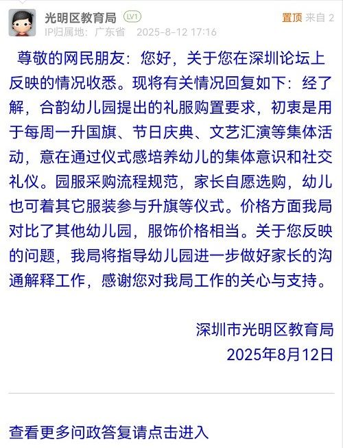 尊敬的網(wǎng)民朋友:您好,關(guān)于您在深圳論壇上反映的情況收悉?,F(xiàn)將有關(guān)情況回復(fù)如下:經(jīng)了解,合韻幼兒園提出的禮服購置要求,初衷是用于每周一升國旗、節(jié)日慶典、文藝匯演等集體活動(dòng),意在通過儀式感培養(yǎng)幼兒的集體意識(shí)和社交禮儀。園服采購流程規(guī)范,家長自愿選購,幼兒也可著其它服裝參與升旗等儀式。價(jià)格方面我局對(duì)比了其他幼兒園,服飾價(jià)格相當(dāng)。關(guān)于您反映的問題,我局將指導(dǎo)幼兒園進(jìn)一步做好家長的溝通解釋工作,感謝您對(duì)我局工作的關(guān)心與支持。