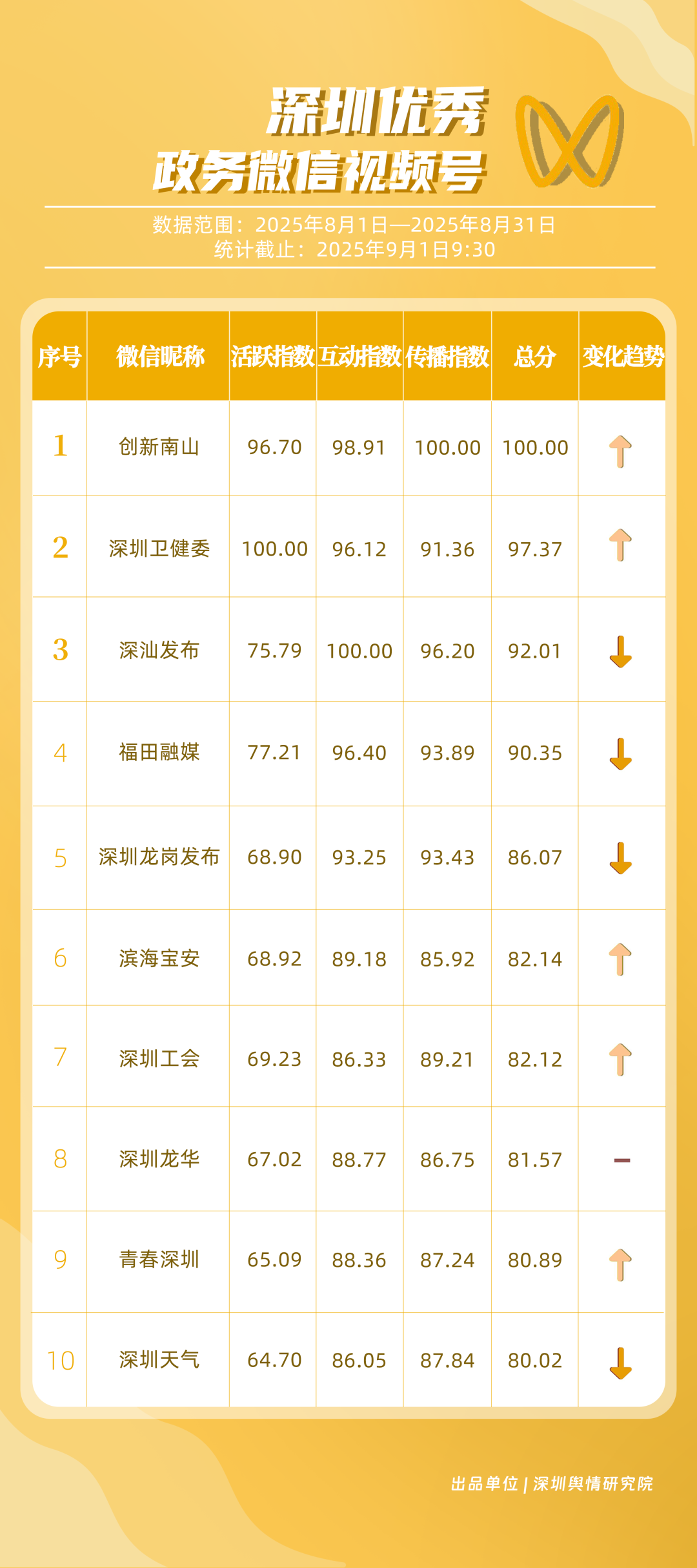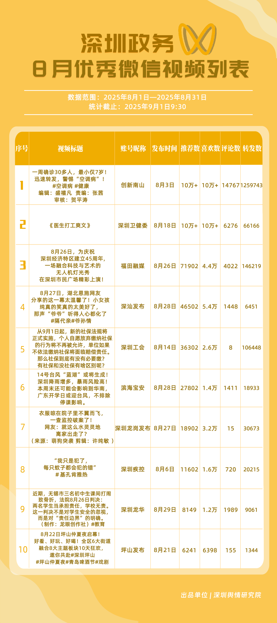 8月,獲得“深圳優(yōu)秀政務(wù)微信視頻號”稱號的是“創(chuàng)新南山”“深圳衛(wèi)健委”“深汕發(fā)布”“福田融媒”“深圳龍崗發(fā)布”“濱海寶安”“深圳工會”“深圳龍華”“青春深圳”“深圳天氣”。其中,“創(chuàng)新南山”一視頻提醒市民警惕“空調(diào)病”,獲百萬次轉(zhuǎn)發(fā),賬號憑借該視頻位列榜單第一名;“深圳衛(wèi)健委”視頻“醫(yī)生打工爽文”“傷痛蚊學(xué)”等作品在微信視頻號平臺獲得較好數(shù)據(jù),助推其位列榜單第二名;“深汕發(fā)布”在內(nèi)容互動性上獲得較好成效,單項指標得分達到100分,以92.01的評分位列榜單第三名?!案L锶诿健薄吧钲邶垗彴l(fā)布”等賬號也獲得不錯成績,上榜微信視頻號依托平臺的傳播優(yōu)勢,用簡短視頻呈現(xiàn)各類信息,打造政務(wù)宣傳的亮眼名片。