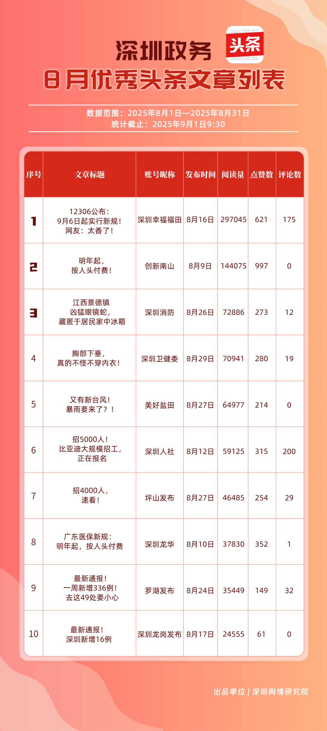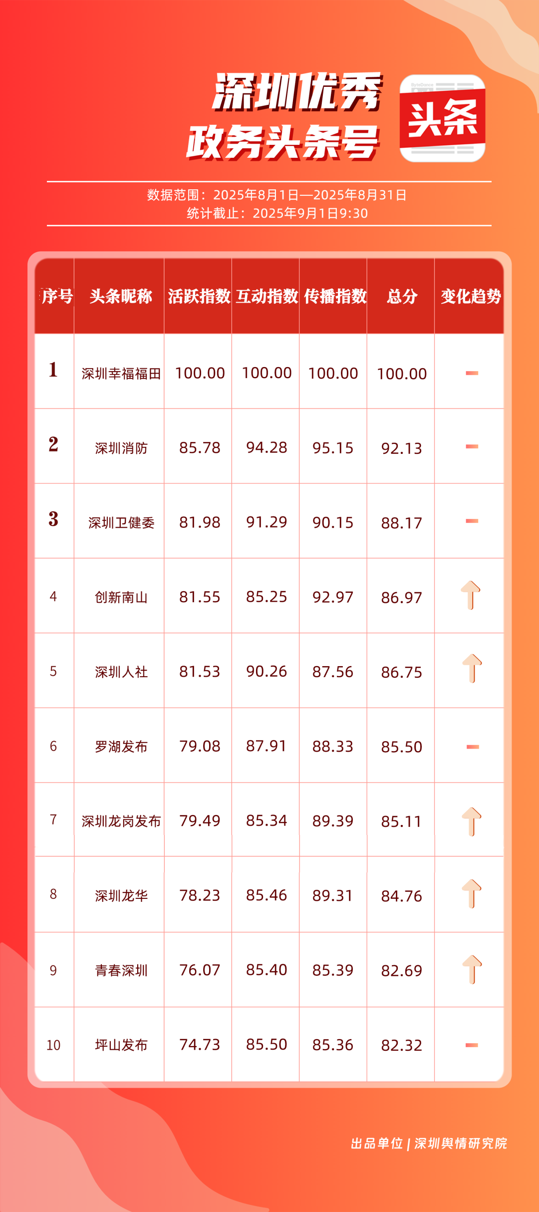 8月,“深圳幸福福田”“深圳消防”“深圳衛(wèi)健委”“創(chuàng)新南山”“深圳人社”“羅湖發(fā)布”“深圳龍崗發(fā)布”“深圳龍華”“青春深圳”“坪山發(fā)布”共10個政務(wù)頭條號入選“優(yōu)秀政務(wù)頭條號”榜單?!吧钲谛腋8L铩睉{借持續(xù)優(yōu)異的綜合表現(xiàn),以滿分成績穩(wěn)居榜單首位,彰顯出強大的政務(wù)傳播力與影響力;“深圳消防”“深圳衛(wèi)健委”則以穩(wěn)定的內(nèi)容質(zhì)量與深厚的民眾基礎(chǔ),持續(xù)為市民提供權(quán)威、及時的服務(wù)信息,排名穩(wěn)固?!皠?chuàng)新南山”“深圳人社”等上榜賬號亦表現(xiàn)亮眼,聚焦民生服務(wù)傳遞政策溫度,共同構(gòu)成政務(wù)新媒體矩陣的中堅力量,為城市治理與民生服務(wù)注入鮮活動能。