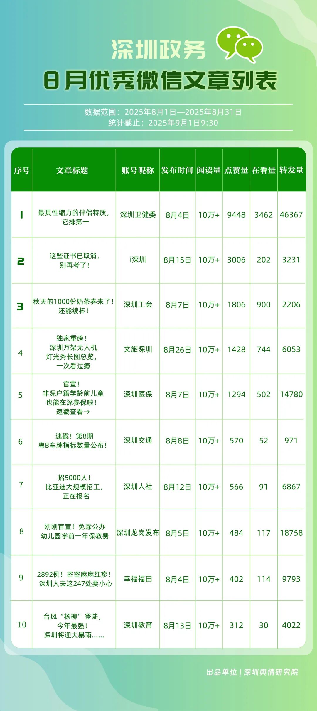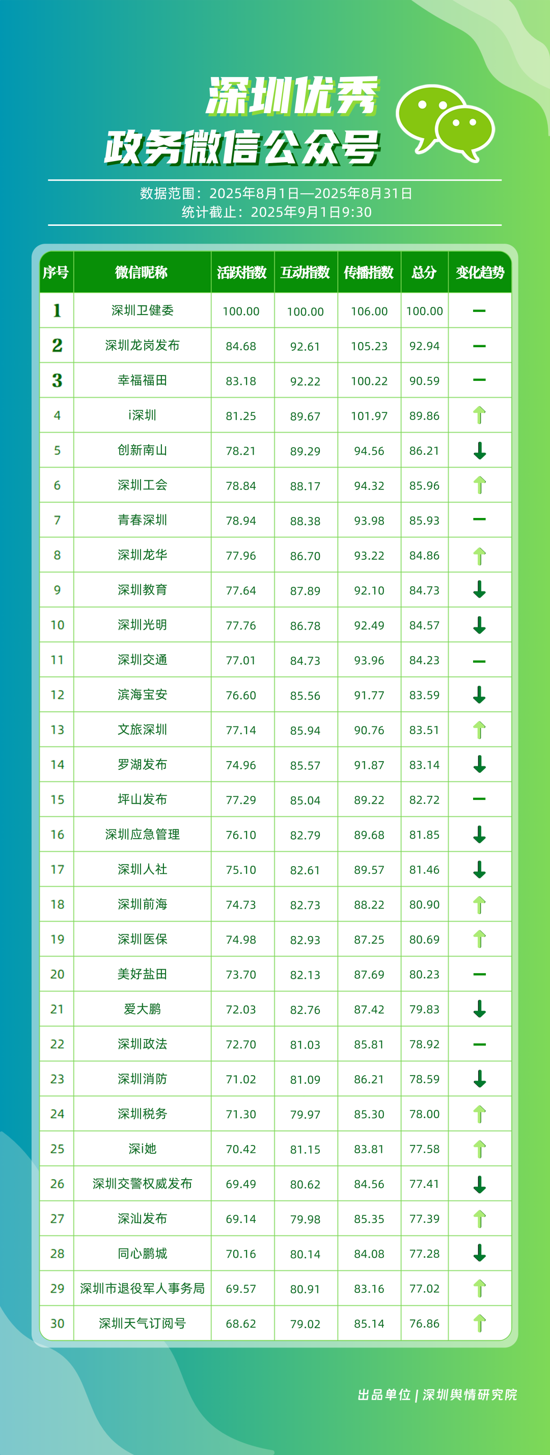 8月,30個政務(wù)微信公眾號入選“深圳優(yōu)秀政務(wù)微信公眾號”榜單,其中包括“深圳衛(wèi)健委”“深圳龍崗發(fā)布”“幸福福田”“i深圳”“創(chuàng)新南山”“深圳工會”“青春深圳”“深圳龍華”“深圳教育”“深圳光明”等。8月,“深圳衛(wèi)健委”66篇推文獲得超10萬次閱讀,以滿分位于榜單首位;“深圳龍崗發(fā)布”積極傳遞民生信息,依托區(qū)域活動開展宣傳,推動傳播效果顯著提升,位居第二;“幸福福田”關(guān)注區(qū)域發(fā)展動態(tài),排名第三?!癷深圳”“創(chuàng)新南山”“深圳工會”“青春深圳”等政務(wù)賬號在信息發(fā)布中不斷提升內(nèi)容豐富性,深耕優(yōu)質(zhì)服務(wù),評分在85分以上。上榜微信公眾號立足自身特色優(yōu)勢,以精品內(nèi)容為核心競爭力,在政務(wù)傳播領(lǐng)域樹立了標桿形象,成為兼具影響力與公信力的示范樣本。