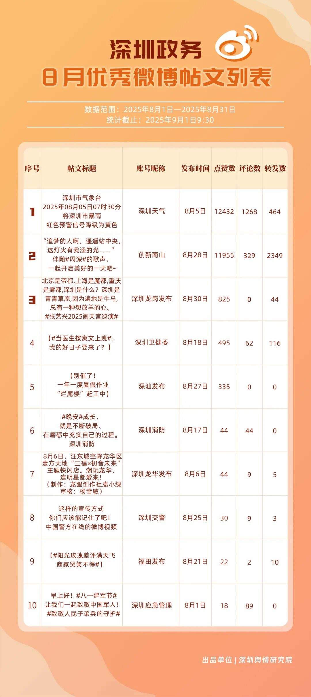 8月,“深圳天氣”“創(chuàng)新南山”“深圳消防”“深圳衛(wèi)健委”“深圳龍崗發(fā)布”“福田發(fā)布”“深汕發(fā)布”“深圳公安”“深圳應(yīng)急管理”“深圳交警”等20個賬號入選“優(yōu)秀政務(wù)微博號”。其中,“深圳天氣”持續(xù)以優(yōu)質(zhì)內(nèi)容受到網(wǎng)民肯定,蟬聯(lián)榜首;“創(chuàng)新南山”傳播指數(shù)得分再提升,總分96.45,排名保持在第二位;“深圳消防”積極發(fā)布消防相關(guān)內(nèi)容,以93.25分位列第三。上榜優(yōu)秀政務(wù)微博賬號精準把握網(wǎng)民興趣點,內(nèi)容獨具風采,收獲網(wǎng)民認可,實現(xiàn)了較好的傳播效果。
