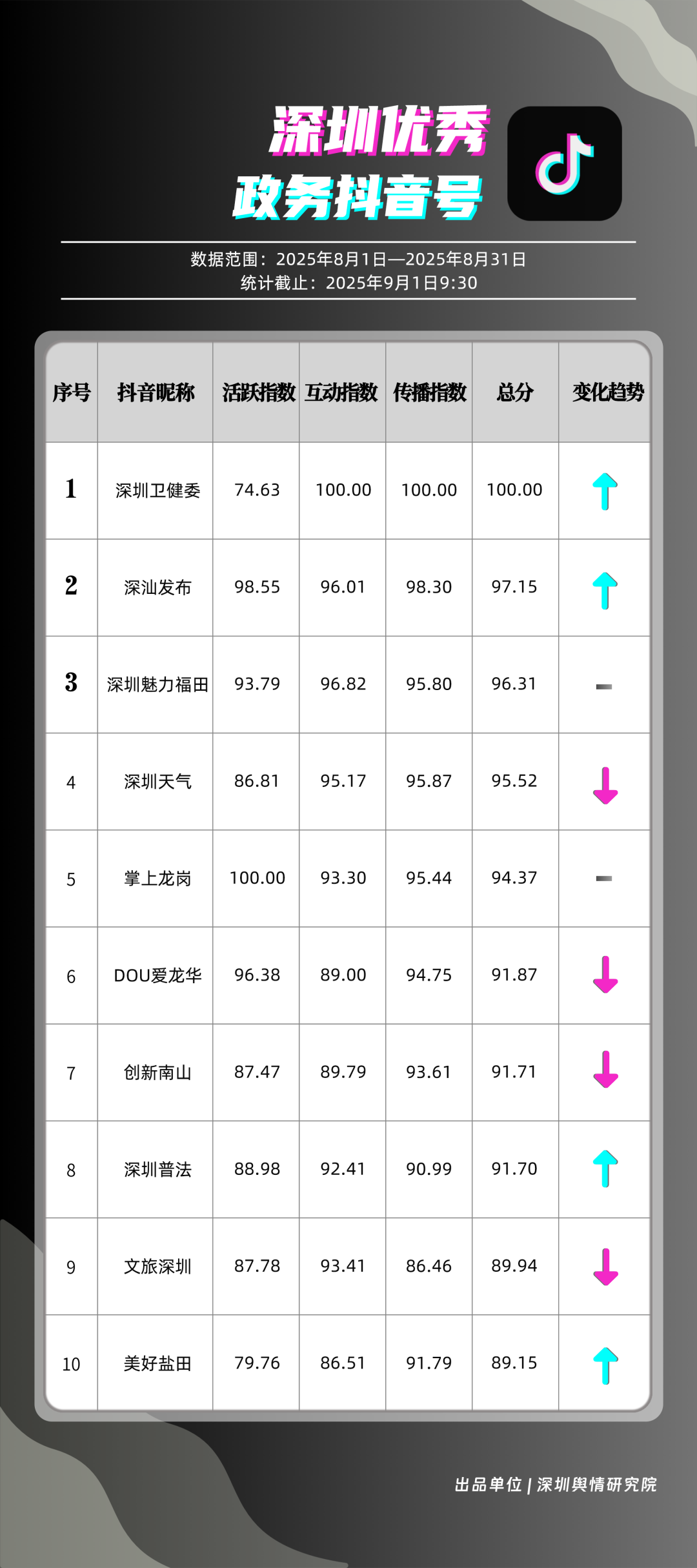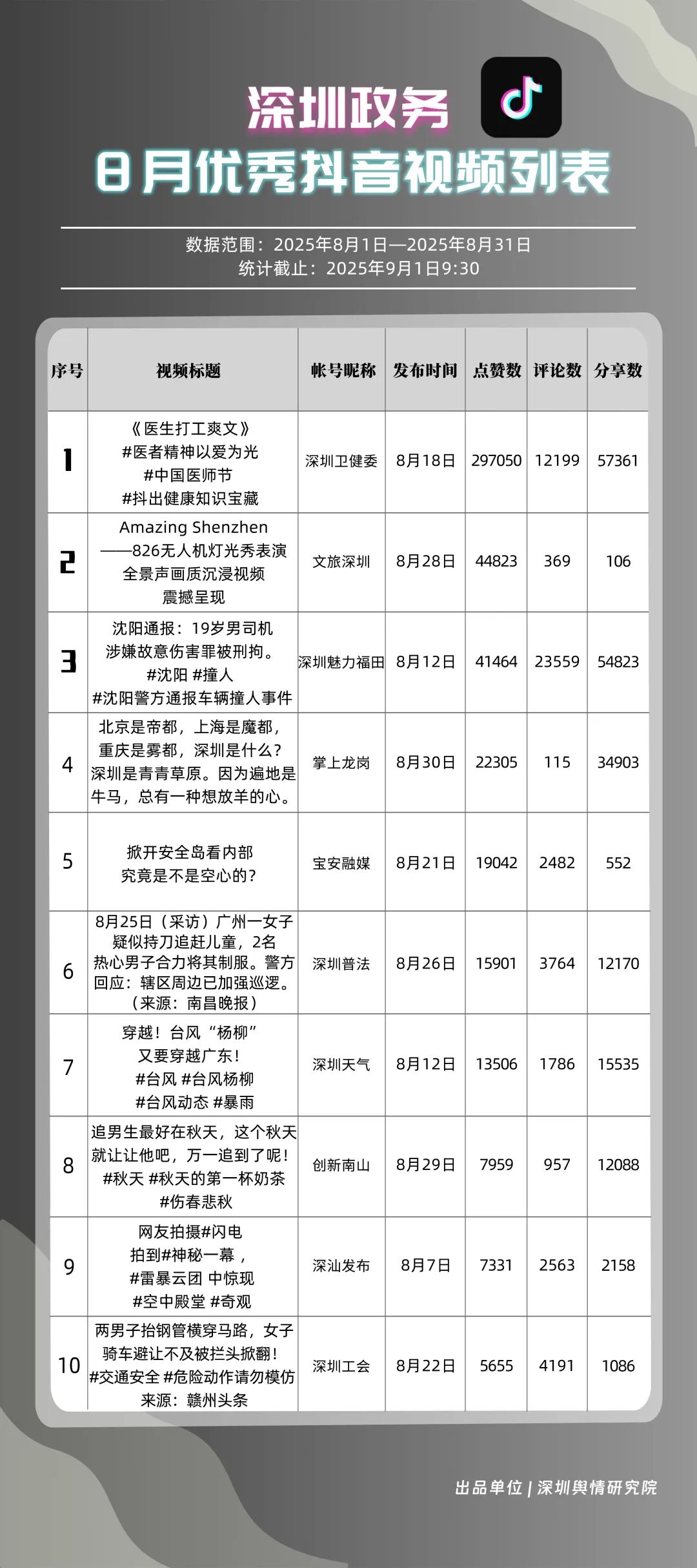 8月,“深圳衛(wèi)健委”“深汕發(fā)布”“深圳魅力福田”“深圳天氣”“掌上龍崗”“DOU愛龍華”“創(chuàng)新南山”“深圳普法”“文旅深圳”“美好鹽田”共10個政務(wù)抖音號獲得“優(yōu)秀政務(wù)抖音號”稱號?!吧钲谛l(wèi)健委”內(nèi)容吸引大量網(wǎng)民關(guān)注,4條視頻累計獲得超50萬次點贊,排名從上期的第九名上升至第一名;“深汕發(fā)布”憑借較高的傳播指數(shù)評分,位列第二名,排名有所上升?!吧钲邝攘ΩL铩薄吧钲谔鞖狻钡荣~號緊隨其后,得分均在95分左右。上榜的優(yōu)秀政務(wù)抖音號深耕優(yōu)質(zhì)創(chuàng)作,精準把握網(wǎng)民興趣點,使作品收獲高點贊、高轉(zhuǎn)發(fā),推動評論區(qū)形成良性互動氛圍,以優(yōu)秀內(nèi)容提升政務(wù)傳播效能。