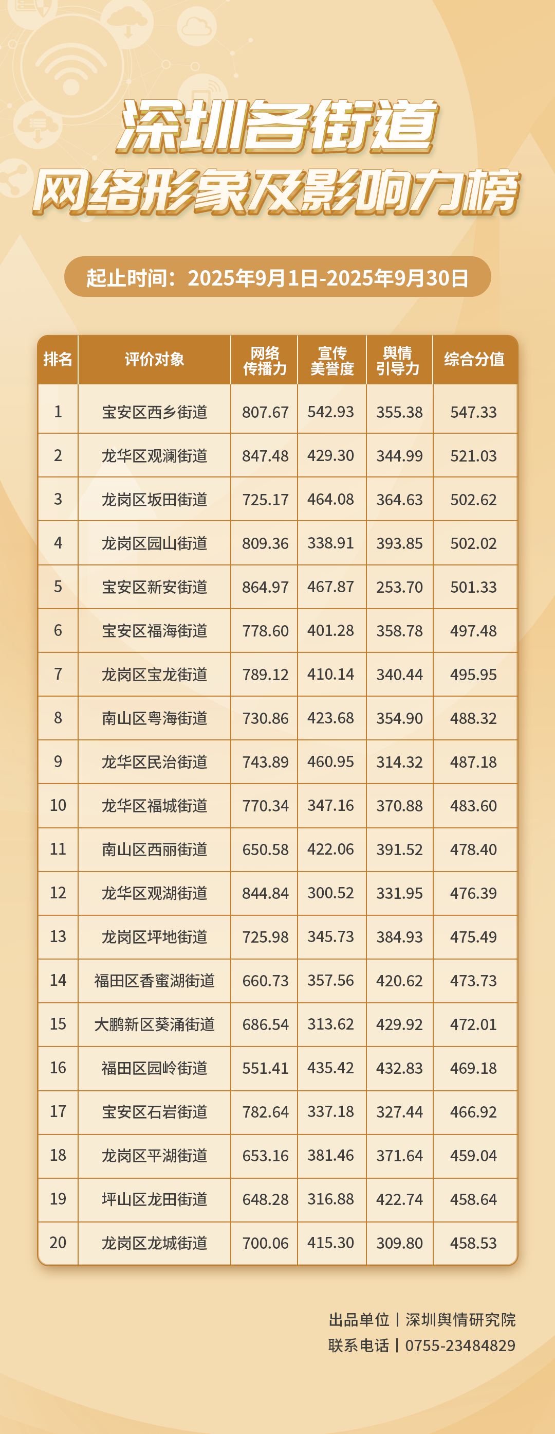 為深入了解深圳市各街道的網(wǎng)絡(luò)形象構(gòu)建狀況和社會(huì)影響,推動(dòng)街道治理“提質(zhì)增效”,增強(qiáng)城市高質(zhì)量發(fā)展動(dòng)能,深圳輿情研究院編制推出《深圳各街道網(wǎng)絡(luò)形象及影響力榜》。榜單具有獨(dú)立客觀的評(píng)價(jià)體系,通過(guò)數(shù)據(jù)采集和分析,評(píng)估各街道的網(wǎng)絡(luò)傳播力、宣傳美譽(yù)度及輿情引導(dǎo)力,并對(duì)全市11個(gè)區(qū)共78個(gè)街道的網(wǎng)絡(luò)形象及影響力進(jìn)行綜合排名。