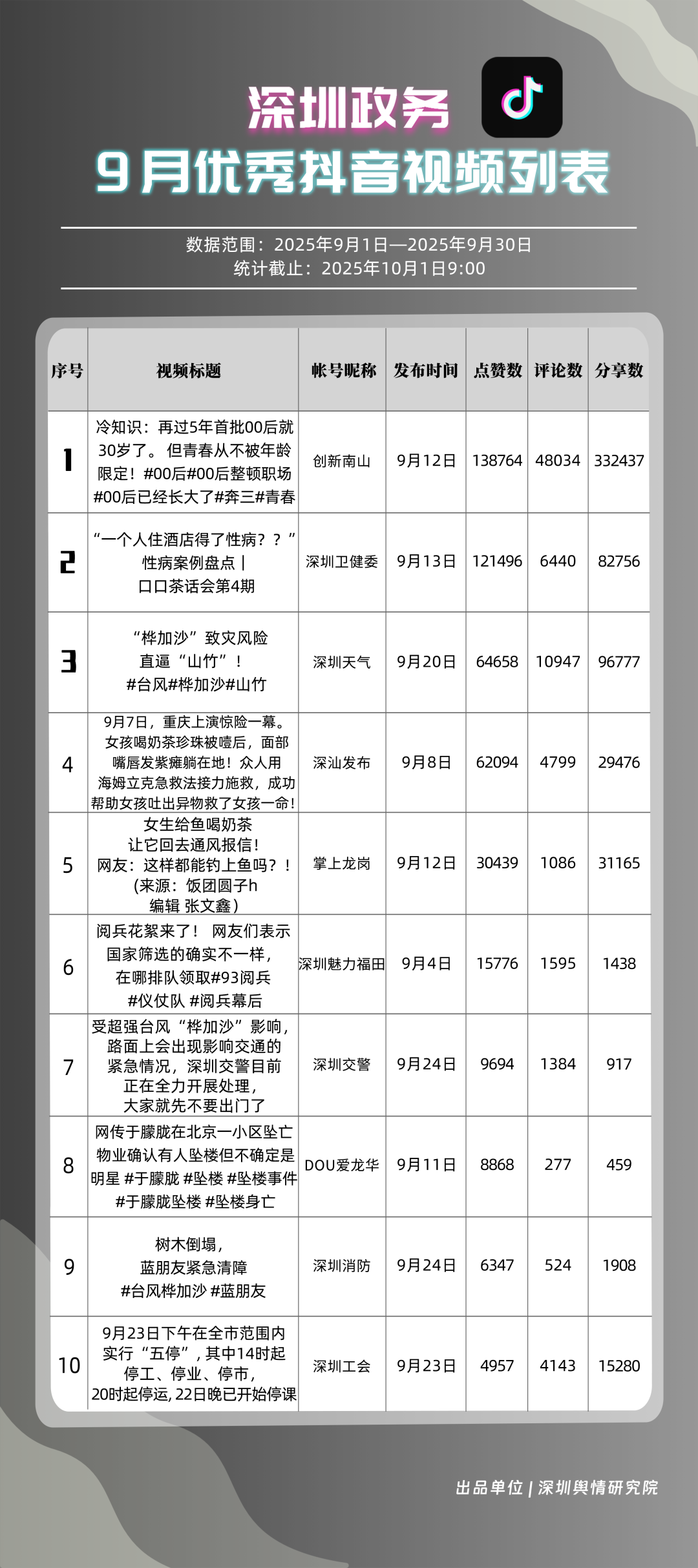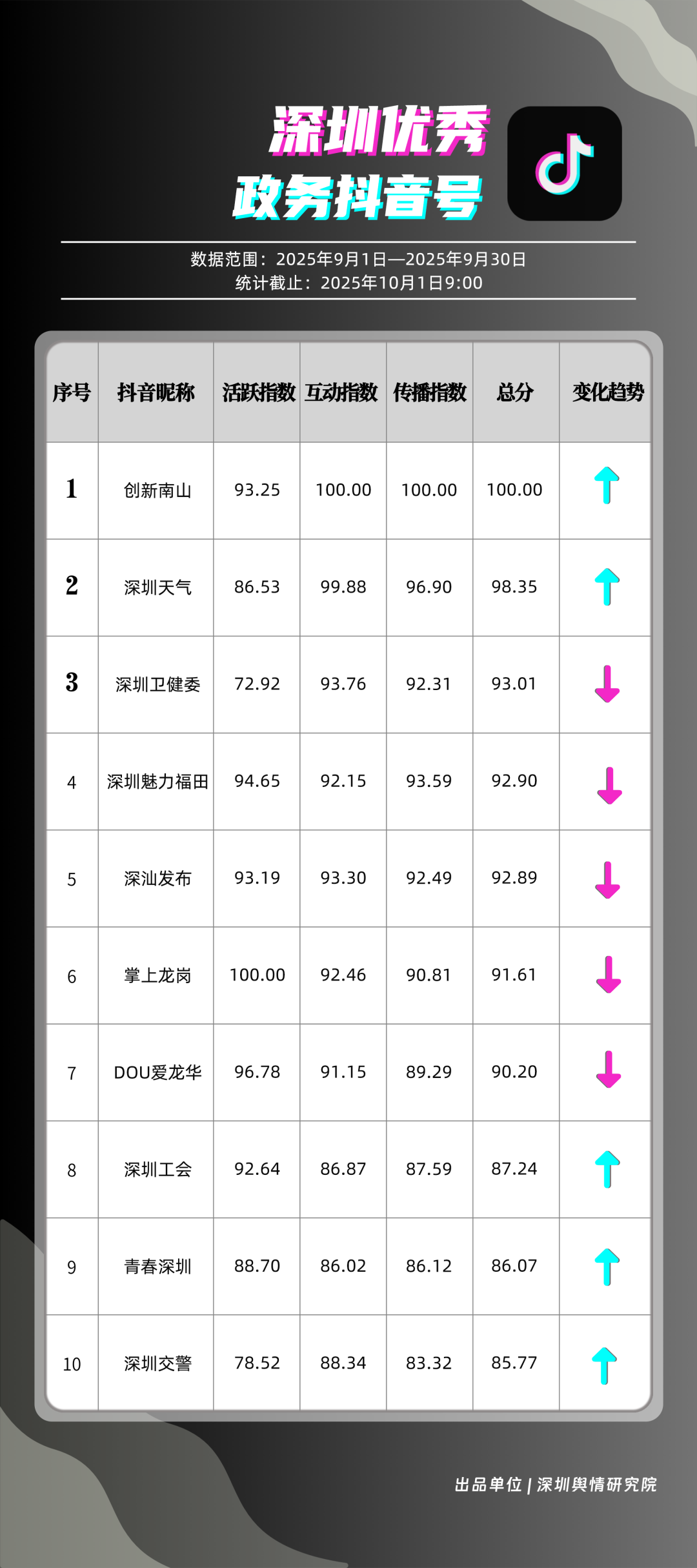 9月,獲得“優(yōu)秀政務(wù)抖音號(hào)”稱號(hào)的是“創(chuàng)新南山”“深圳天氣”“深圳衛(wèi)健委”“深圳魅力福田”“深汕發(fā)布”“掌上龍崗”“DOU愛龍華”“深圳工會(huì)”“青春深圳”“深圳交警”?!皠?chuàng)新南山”以一條有關(guān)“青春不被年齡限定”的視頻獲得超34萬次轉(zhuǎn)發(fā),超14萬次點(diǎn)贊,助力其在抖音榜單居于榜首;“深圳天氣”多條臺(tái)風(fēng)相關(guān)視頻吸引大量網(wǎng)民關(guān)注、互動(dòng),在抖音平臺(tái)得分超98分;“深圳衛(wèi)健委”“深圳魅力福田”“深汕發(fā)布”等賬號(hào)緊隨其后,得分均在92分以上。上榜的優(yōu)秀政務(wù)抖音號(hào)以“有溫度”的敘事表達(dá),將宣傳、服務(wù)內(nèi)容轉(zhuǎn)化為網(wǎng)民喜聞樂見的視頻,收獲高點(diǎn)贊、高轉(zhuǎn)發(fā)的流量實(shí)績(jī),更在評(píng)論區(qū)形成了良性互動(dòng)生態(tài),深度運(yùn)營收獲了較好成果。