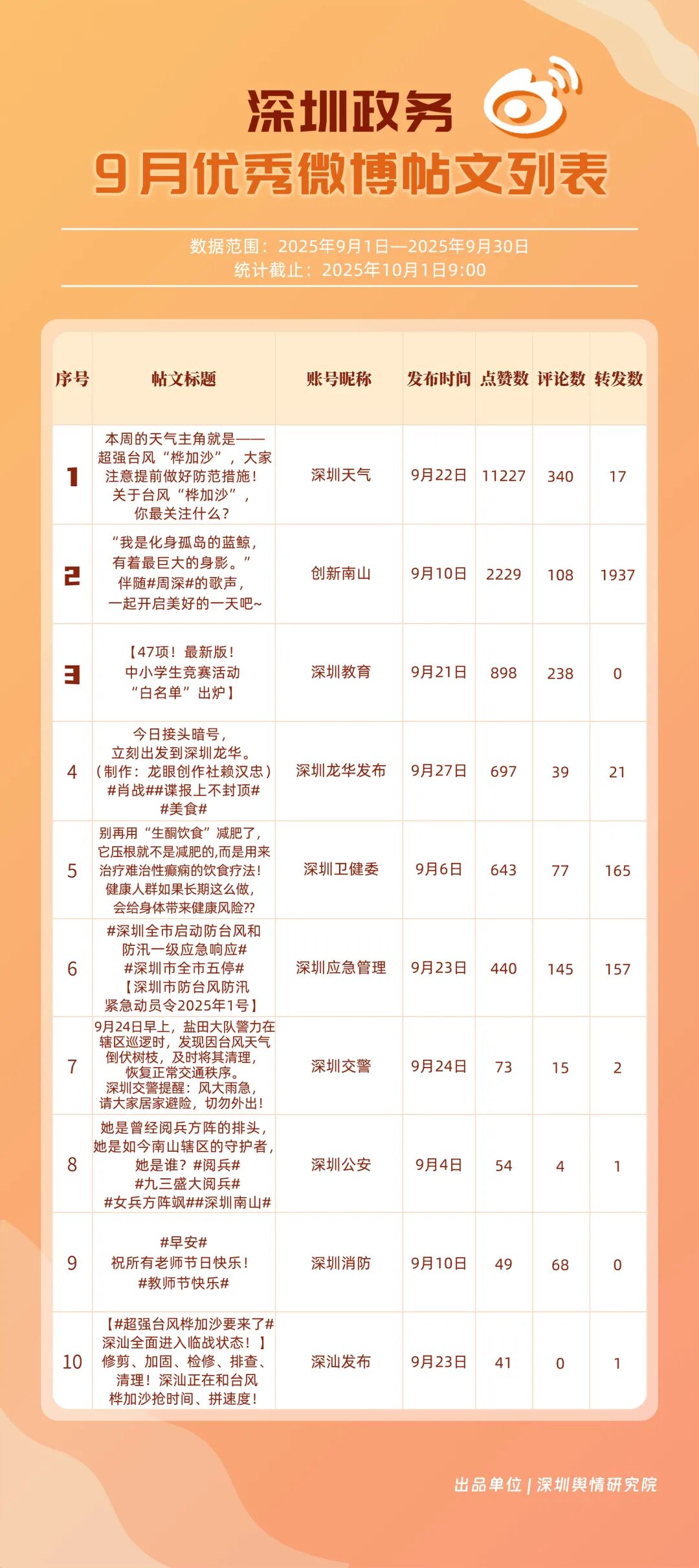 9月,20個(gè)賬號(hào)入選“優(yōu)秀政務(wù)微博號(hào)”榜單,其中包括:“深圳天氣”“創(chuàng)新南山”“深圳龍崗發(fā)布”“深圳衛(wèi)健委”“深圳消防”“深圳應(yīng)急管理”“福田發(fā)布”“深圳公安”“深圳交警”“深圳教育”等。其中,“深圳天氣”蟬聯(lián)榜首,尤其9月出現(xiàn)臺(tái)風(fēng)天氣,賬號(hào)受關(guān)注度再提升;“創(chuàng)新南山”賬號(hào)以多維度內(nèi)容策略實(shí)現(xiàn)傳播效能提升,其內(nèi)容中與歌手周深的聯(lián)動(dòng)也成為一大亮點(diǎn),獲得了較好傳播效果,以94.34分排名榜單第二;“深圳龍崗發(fā)布”“深圳衛(wèi)健委”兩賬號(hào)得分均在93分以上,在區(qū)域宣傳、內(nèi)容科普方向發(fā)力。上榜優(yōu)秀微博賬號(hào)展現(xiàn)出較高的內(nèi)容創(chuàng)新能力,以年輕化語態(tài)構(gòu)建傳播體系,形成兼具專業(yè)性與傳播力的優(yōu)秀案例。