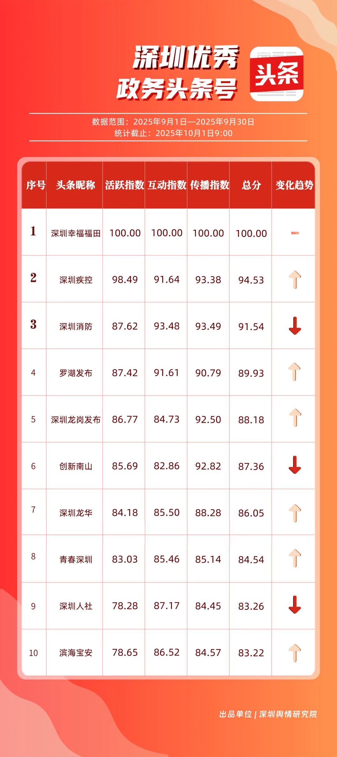 9月,“深圳幸福福田”“深圳疾控”“深圳消防”“羅湖發(fā)布”“深圳龍崗發(fā)布”“創(chuàng)新南山”“深圳龍華”“青春深圳”“深圳人社”“濱海寶安”共10個(gè)政務(wù)頭條號(hào)入選“優(yōu)秀政務(wù)頭條號(hào)”榜單?!吧钲谛腋8L铩狈€(wěn)居榜單首位,在傳播、互動(dòng)等方面均表現(xiàn)卓越;“深圳疾控”關(guān)注民生健康,有關(guān)“喝茶的好處”“非正規(guī)醫(yī)美針風(fēng)險(xiǎn)”兩篇文章閱讀均超10萬次,為市民提供健康信息;“深圳消防”聚焦消防安全領(lǐng)域,提醒市民注意安全。相關(guān)上榜賬號(hào)表現(xiàn)優(yōu)異,注重內(nèi)容實(shí)用化、互動(dòng)場(chǎng)景化,彰顯了政務(wù)新媒體的服務(wù)效能。