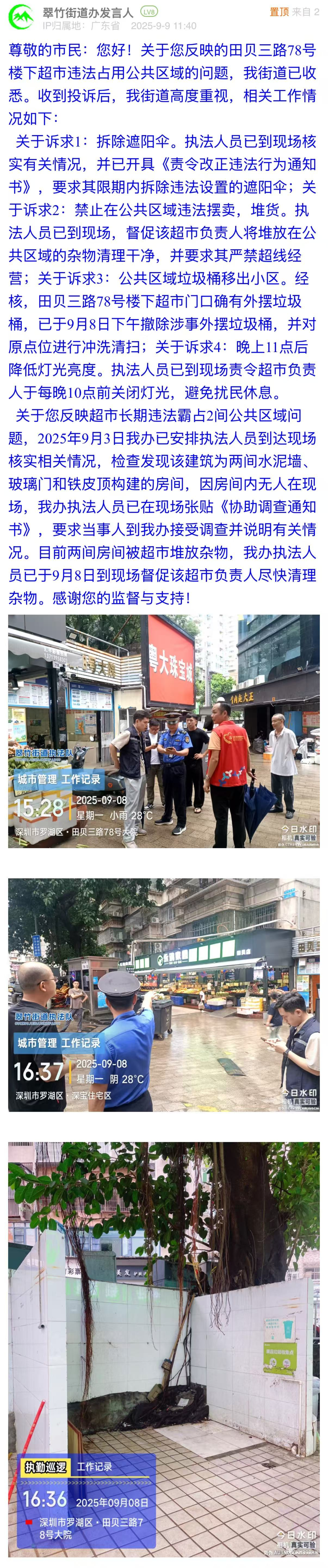 案例點評:本案例中,翠竹街道辦立足市民訴求,對違規(guī)搭建遮陽傘、占用公共區(qū)域、違規(guī)堆放垃圾、店面燈牌亮度過高這四個問題,街道均做到快速響應(yīng),并以圖片展示治理效果?;貞?yīng)既體現(xiàn)了基層執(zhí)法的規(guī)范性與時效性,又展現(xiàn)了對民生細節(jié)的關(guān)注力,踐行了“小事不小辦、事事有回音”的理念,為同類民生訴求的解決提供了可借鑒范式。