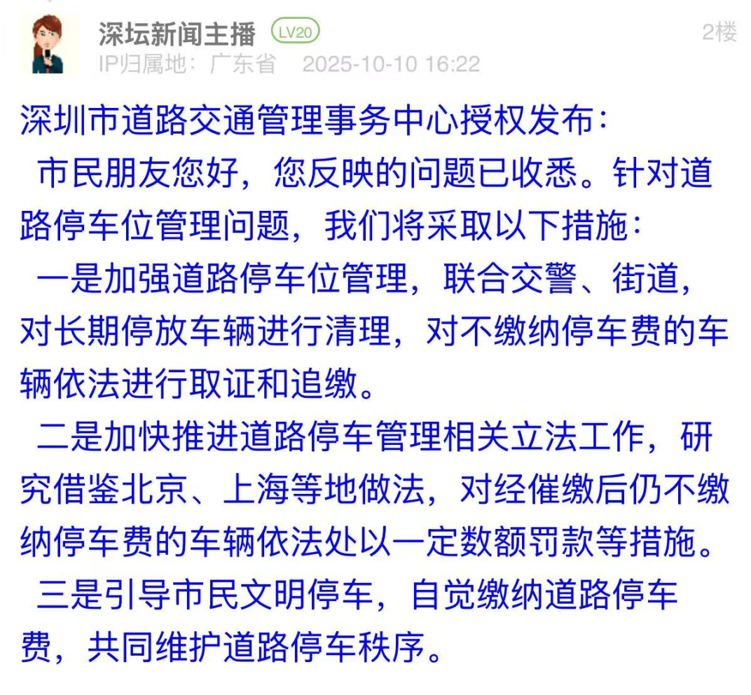優(yōu)化建議:市民在帖文中反映,其此前的投訴件被標記為“辦結(jié)”,但霸位車輛依舊未被移走,現(xiàn)場問題未解決,質(zhì)疑相關(guān)部門執(zhí)行力不足。對于市民的再次投訴,深圳市道路交通管理事務(wù)中心的回應(yīng)存在公式化、未切實回應(yīng)市民核心關(guān)切的問題,僅以“加強管理”“推進立法”“引導文明停車”等回復,難以消除公眾對治理執(zhí)行力的疑慮。建議后續(xù)強化回應(yīng)針對性,具體問題具體答復,如公開執(zhí)法流程、提供處置證據(jù)等,以務(wù)實態(tài)度回應(yīng)市民監(jiān)督,提升治理公信力。