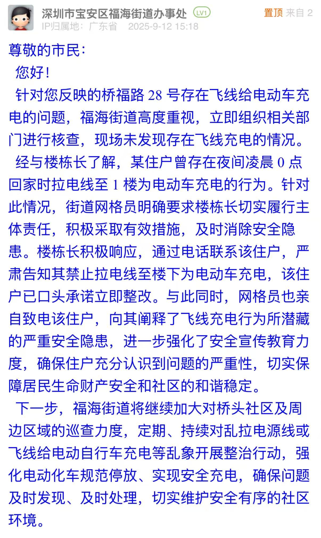 案例點評:福海街道辦對電動車“飛線充電”問題展現(xiàn)出快速響應(yīng)、權(quán)責明晰的治理態(tài)度,第一時間組織核查,既明確主體責任、嚴令整改,又細致開展安全教育,讓住戶充分認知“飛線充電”的嚴重危害,體現(xiàn)執(zhí)法和普法的雙重擔當?;貞?yīng)中,街道辦還表示將強化巡查力度、開展整治行動,建立長效治理機制,維護社區(qū)安全秩序,彰顯了基層治理中“問題導向、標本兼治”的治理邏輯。