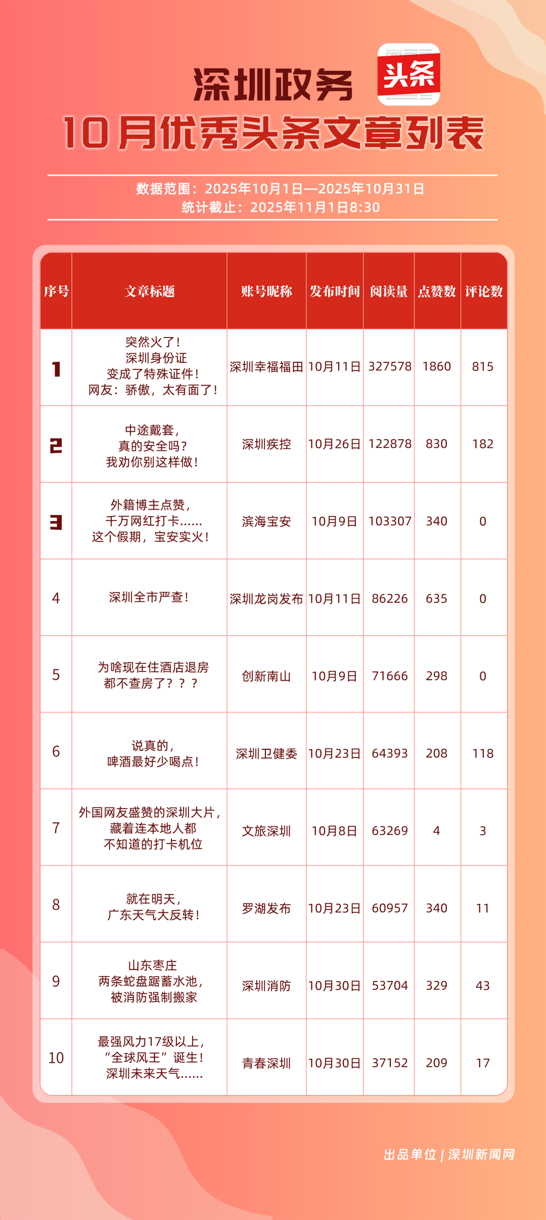 10月,“深圳幸福福田”“深圳疾控”“創(chuàng)新南山”“深圳消防”“羅湖發(fā)布”“青春深圳”“深圳龍崗發(fā)布”“深圳衛(wèi)健委”“深圳龍華”“濱海寶安”共10個(gè)政務(wù)頭條號(hào)入選“優(yōu)秀政務(wù)頭條號(hào)”榜單。“深圳幸福福田”在活躍、互動(dòng)、傳播均收獲較好成果,蟬聯(lián)榜首;“深圳疾控”得分超90分,持續(xù)發(fā)布民生健康類內(nèi)容,為市民健康保駕護(hù)航;“創(chuàng)新南山”內(nèi)容創(chuàng)作緊扣民生與區(qū)域特色,位列榜單第三名?!吧钲谙馈薄傲_湖發(fā)布”等賬號(hào)也位列榜單前列,成為區(qū)域政務(wù)新媒體內(nèi)容創(chuàng)新、信息傳遞的標(biāo)桿。