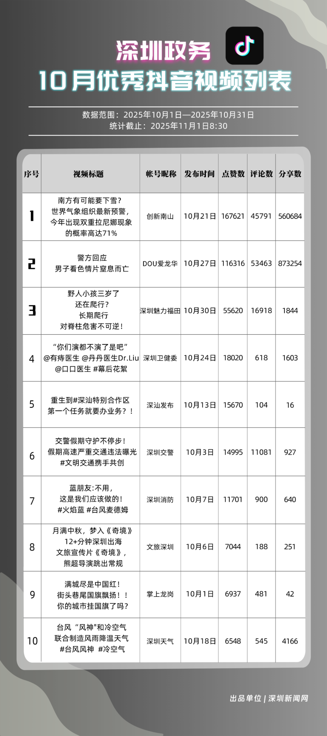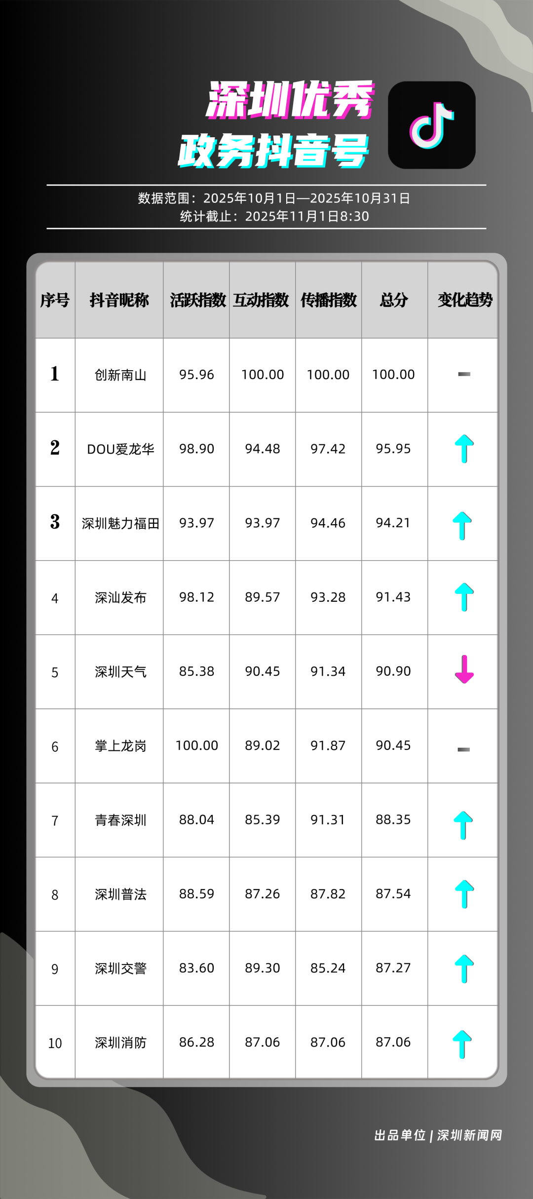10月,獲得“優(yōu)秀政務(wù)抖音號(hào)”稱號(hào)的是“創(chuàng)新南山”“DOU愛龍華”“深圳魅力福田”“深汕發(fā)布”“深圳天氣”“掌上龍崗”“青春深圳”“深圳普法”“深圳交警”“深圳消防”。“創(chuàng)新南山”以總分100分居于榜首,展現(xiàn)出其內(nèi)容創(chuàng)作對(duì)用戶的強(qiáng)大吸引力與傳播力;“DOU愛龍華”與“深圳魅力福田”分別位列第二、三位,得分在95分左右,排名較上期有所上升?!吧钌前l(fā)布”“深圳天氣”“掌上龍崗”等賬號(hào)得分均在90分以上,以年輕化表達(dá)展示實(shí)用信息,也收獲較好互動(dòng)、傳播成績(jī)。