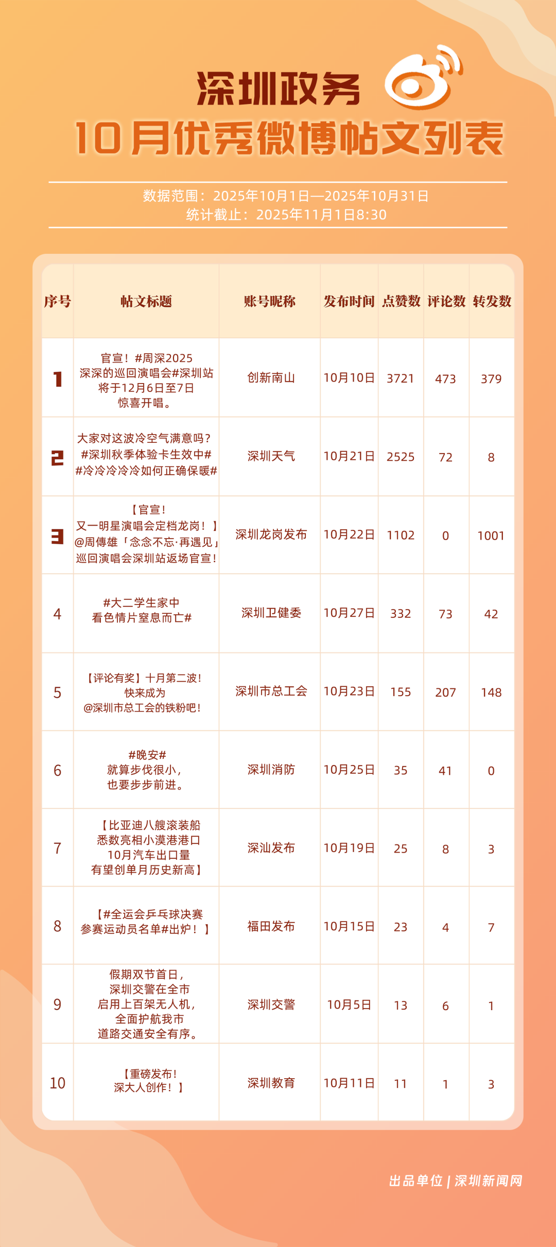 10月,20個(gè)賬號(hào)入選“優(yōu)秀政務(wù)微博號(hào)”榜單,其中包括:“深圳天氣”“深圳龍崗發(fā)布”“深圳市總工會(huì)”“深圳消防”“創(chuàng)新南山”“福田發(fā)布”“深圳衛(wèi)健委”“深汕發(fā)布”“深圳應(yīng)急管理”“深圳公安”等。其中,“深圳天氣”高頻、及時(shí)地發(fā)布天氣相關(guān)內(nèi)容,其中多篇關(guān)于“冷空氣”“入秋”帖文收獲較好互動(dòng)和傳播效果,以100分位列榜單首位;“深圳龍崗發(fā)布”總分97.37分,居于榜單第二,其有關(guān)演唱會(huì)定檔、卷尺哥等內(nèi)容的帖文獲得較好數(shù)據(jù);“深圳市總工會(huì)”關(guān)注職工日常生活,以97.03分居于榜單第三。“深圳消防”“創(chuàng)新南山”等微博賬號(hào)也通過各自的特色內(nèi)容,展現(xiàn)深圳城市治理、民生服務(wù)的溫度。