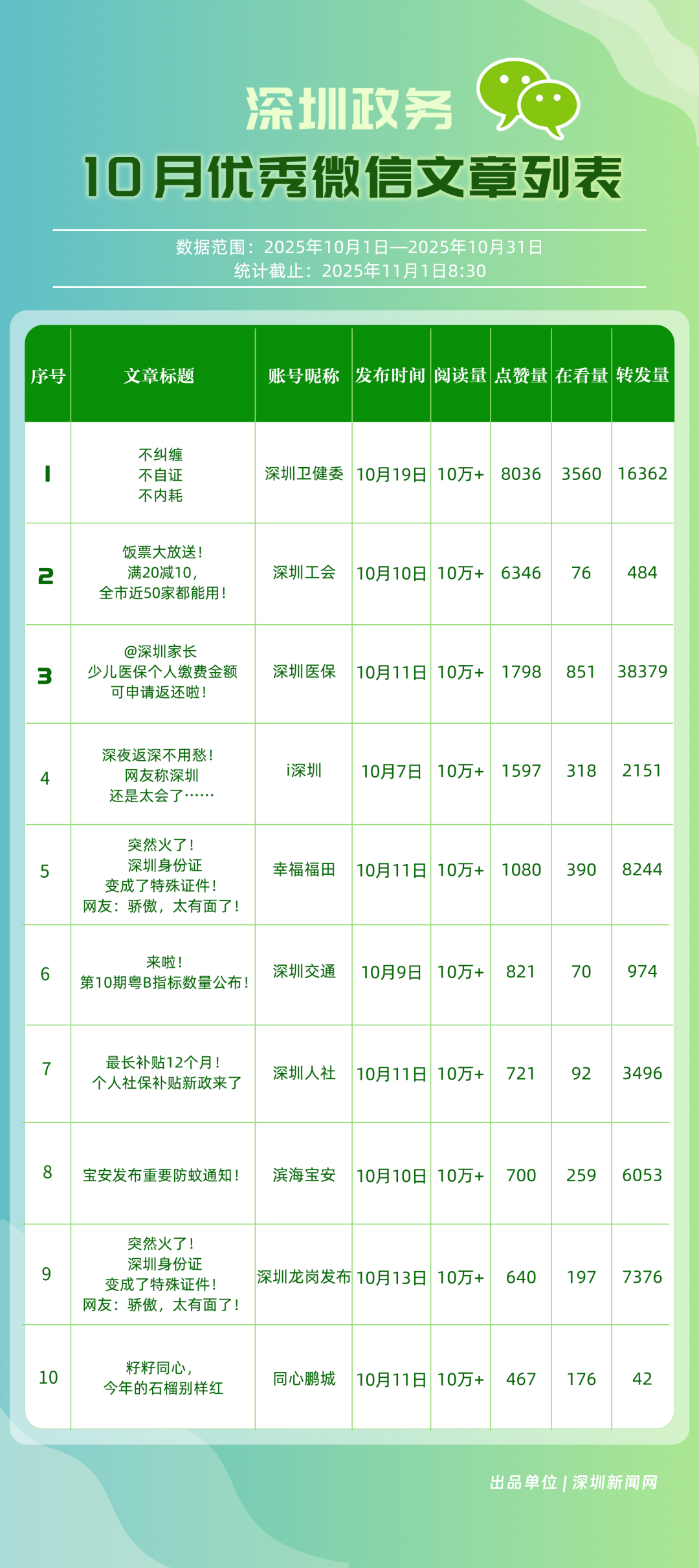 2025年10月期《深圳優(yōu)秀政務(wù)新媒體矩陣》正式發(fā)布,上榜矩陣以深度創(chuàng)新的傳播思路與精細(xì)化的服務(wù)持續(xù)領(lǐng)跑,為政務(wù)新媒體行業(yè)貢獻(xiàn)了可復(fù)制的實(shí)踐經(jīng)驗(yàn),深化政務(wù)信息與公眾喜好的精準(zhǔn)對(duì)接,為深圳政務(wù)新媒體高質(zhì)量發(fā)展注入新動(dòng)能與新活力。