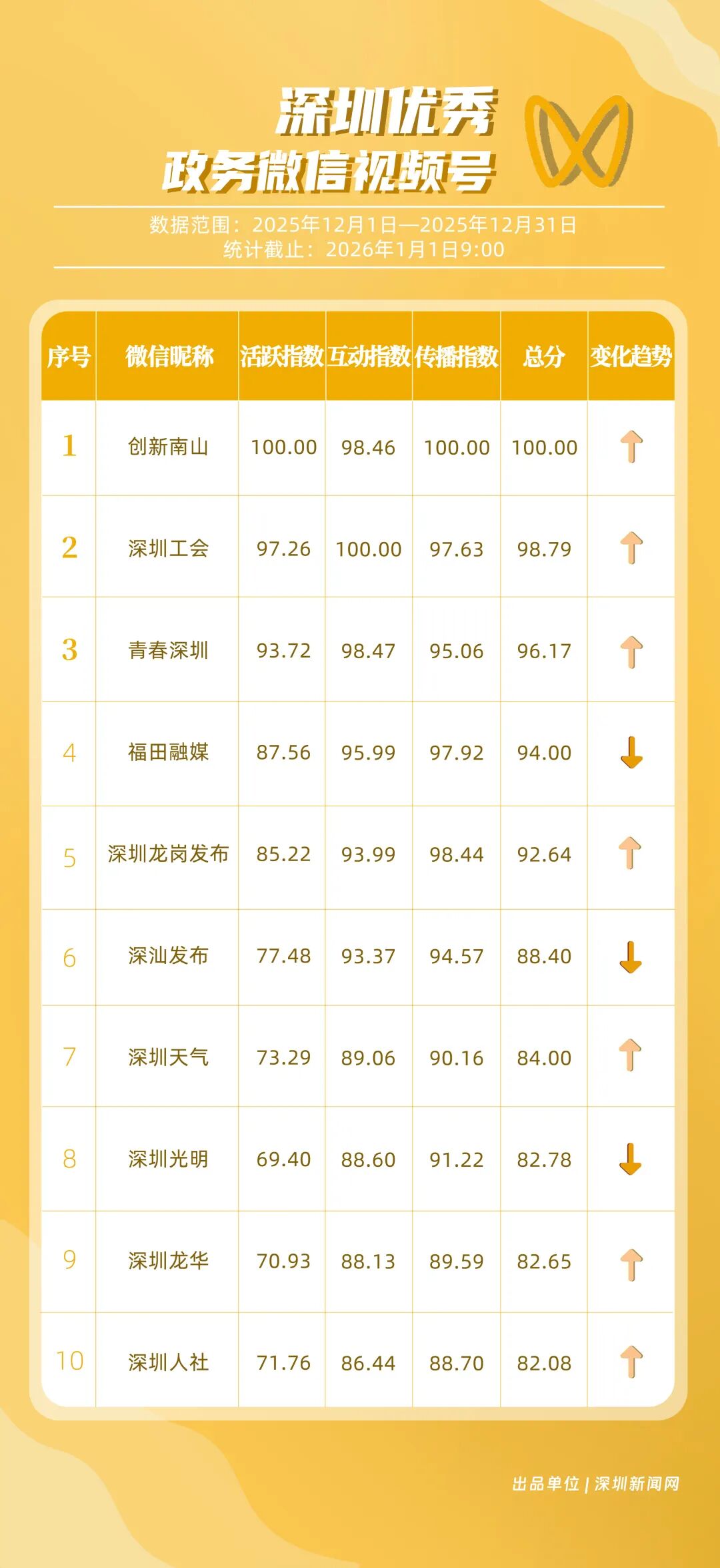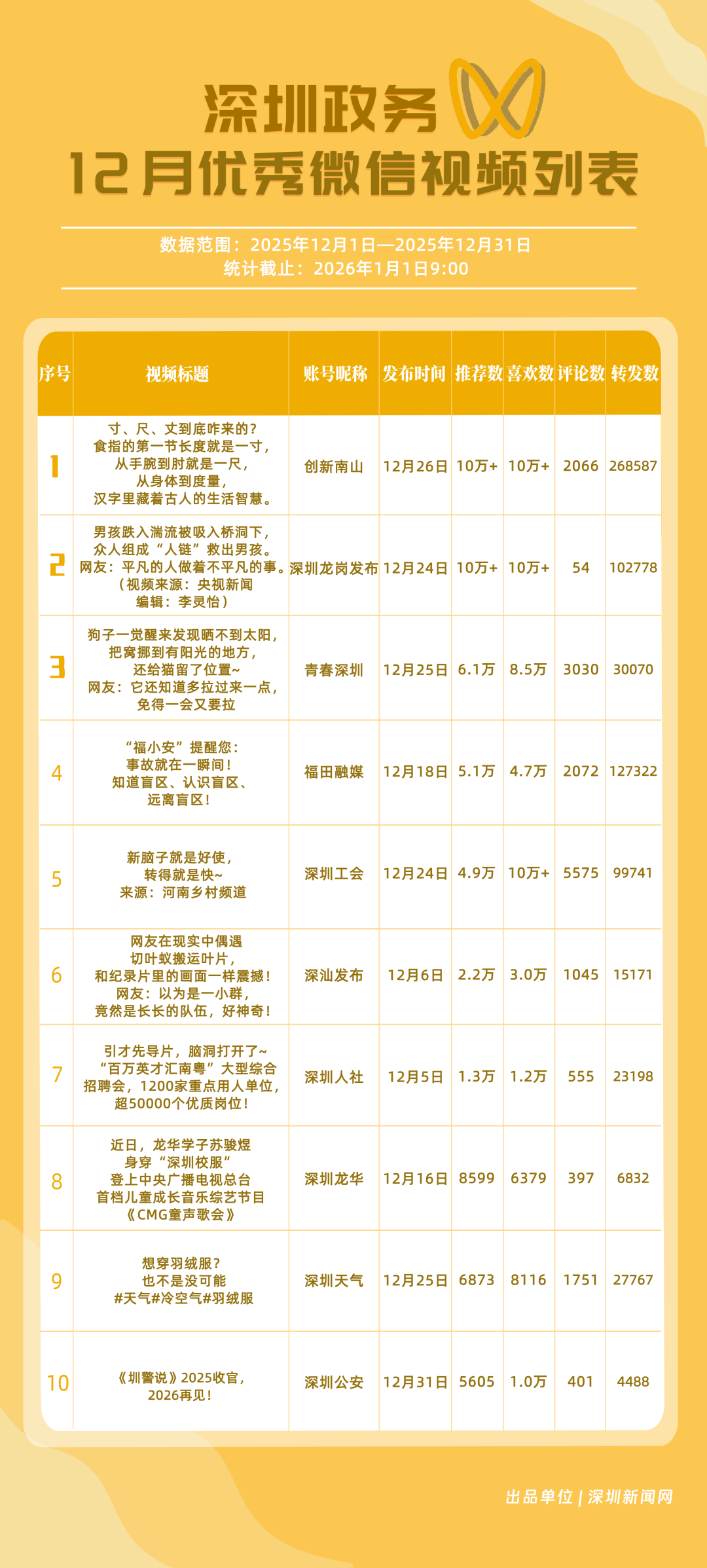 12月,“創(chuàng)新南山”“深圳工會”“青春深圳”“福田融媒”“深圳龍崗發(fā)布”“深汕發(fā)布”“深圳天氣”“深圳光明”“深圳龍華”“深圳人社”榮獲“優(yōu)秀政務(wù)微信視頻號”稱號。“創(chuàng)新南山”活躍指數(shù)、傳播指數(shù)均獲滿分,月作品總轉(zhuǎn)發(fā)量超70萬,領(lǐng)跑榜單;“深圳工會”積極發(fā)布熱點、民生類內(nèi)容,精準對接市民需求,排名上升至第二名;“青春深圳”互動指數(shù)超98分,以高互動量位列榜單第三名?!案L锶诿健薄吧钲邶垗彴l(fā)布”兩賬號立足區(qū)域特色深耕內(nèi)容,得分超90分。上榜微信視頻號以輕量化短視頻為載體,傳播公眾喜聞樂見的政務(wù)、民生內(nèi)容,打造出兼具傳播力與親和力的政務(wù)宣傳新名片。