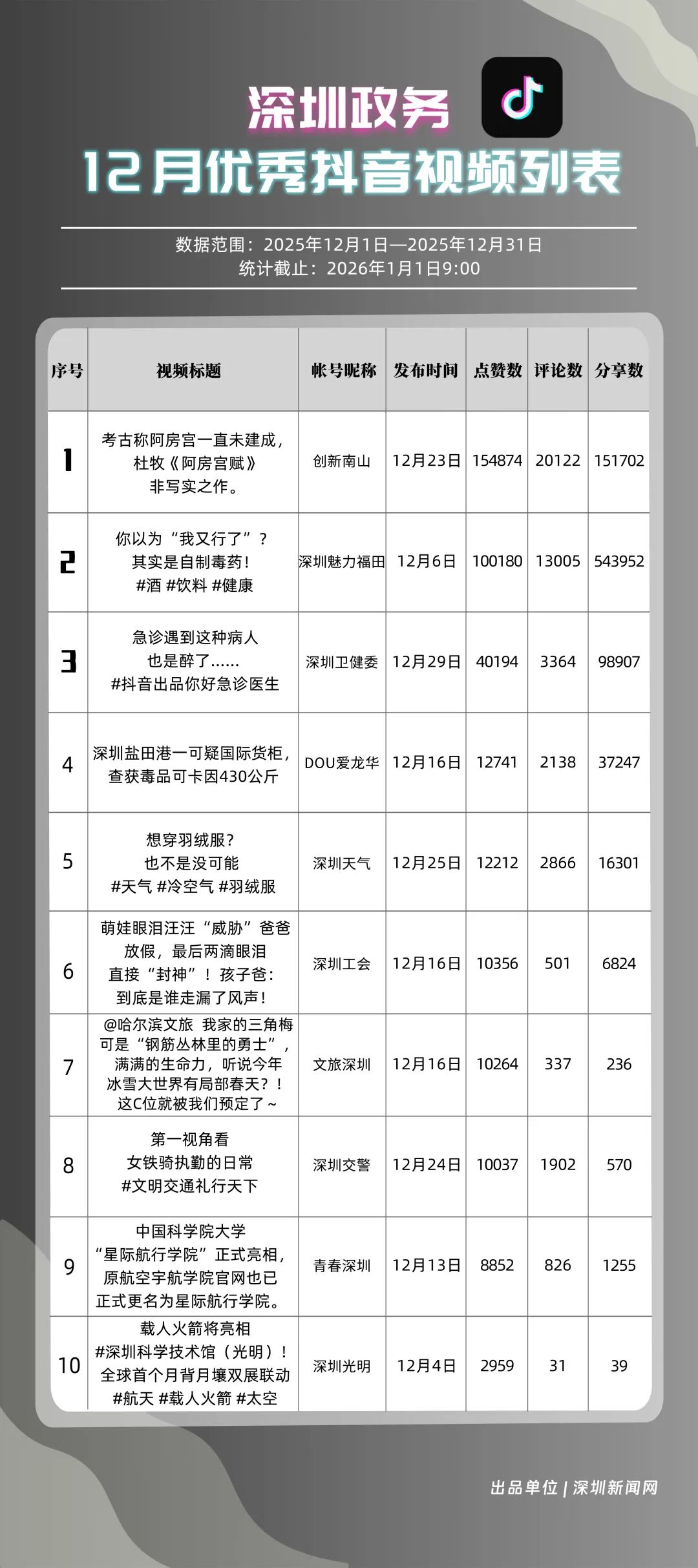 12月,獲得“優(yōu)秀政務(wù)抖音號”稱號的是“創(chuàng)新南山”“深圳魅力福田”“深圳衛(wèi)健委”“深圳天氣”“DOU愛龍華”“青春深圳”“深圳交警”“深汕發(fā)布”“深圳工會”“文旅深圳”?!皠?chuàng)新南山”積極傳播傳統(tǒng)文化、民生健康等多元內(nèi)容,當(dāng)月視頻總點贊數(shù)超120萬,位居榜首;“深圳魅力福田”內(nèi)容激發(fā)用戶主動轉(zhuǎn)發(fā)熱情,在傳播指數(shù)評分較高,位列第二名;“深圳衛(wèi)健委”聚焦民生健康話題,產(chǎn)出高質(zhì)量視頻內(nèi)容,排名上升至第三?!吧钲谔鞖狻薄癉OU愛龍華”“青春深圳”等賬號評分均在86分以上,反映出賬號的內(nèi)容質(zhì)量與用戶粘性突出。上榜政務(wù)抖音號在短視頻傳播賽道持續(xù)深耕,憑借精準的內(nèi)容定位與創(chuàng)新的傳播手法,成功打造出極具影響力的政務(wù)傳播矩陣。