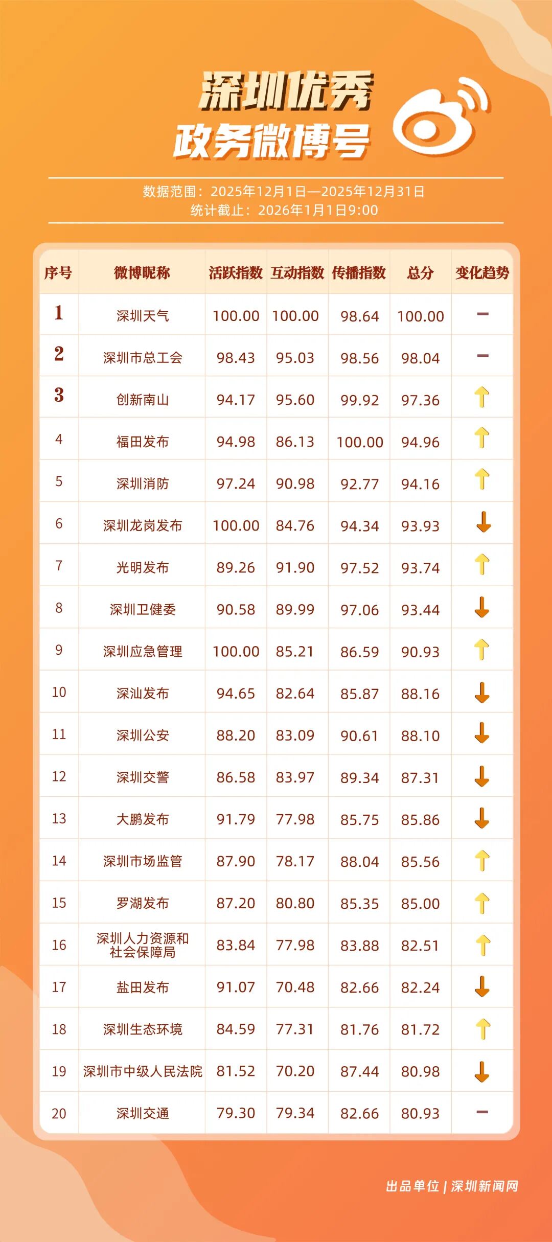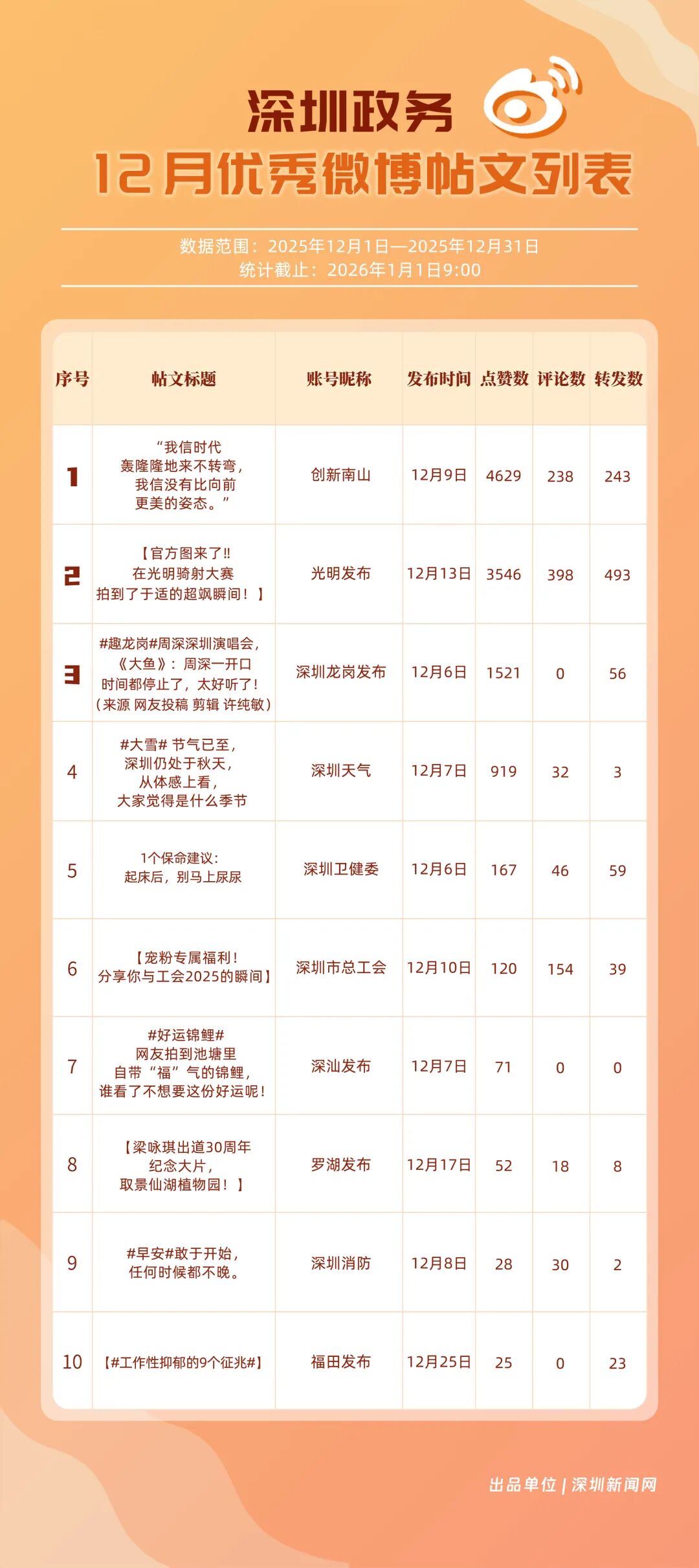 12月,20個賬號入選“優(yōu)秀政務(wù)微博號”榜單,其中包括:“深圳天氣”“深圳市總工會”“創(chuàng)新南山”“福田發(fā)布”“深圳消防”“深圳龍崗發(fā)布”“光明發(fā)布”“深圳衛(wèi)健委”“深圳應(yīng)急管理”“深汕發(fā)布”等。其中,“深圳天氣”精準化發(fā)布天氣信息,高頻次與網(wǎng)民互動,以滿分成績蟬聯(lián)榜首,彰顯其在民生服務(wù)領(lǐng)域的核心價值;“深圳市總工會”積極發(fā)布互動、福利類內(nèi)容,獲得較高用戶參與度與賬號影響力,居于榜單第二;“創(chuàng)新南山”傳播指數(shù)得分超99分,躋身榜單第三?!案L锇l(fā)布”“深圳消防”等賬號聚焦民生熱點、強化互動運營,居于榜單前列,且排名有所提升。12月上榜政務(wù)微博賬號持續(xù)發(fā)力,實現(xiàn)了政務(wù)信息的有效傳播,為政務(wù)新媒體的內(nèi)容運營與價值傳遞提供了可借鑒的實踐樣本。