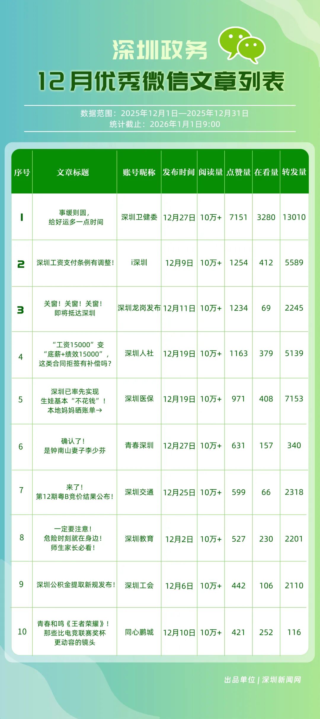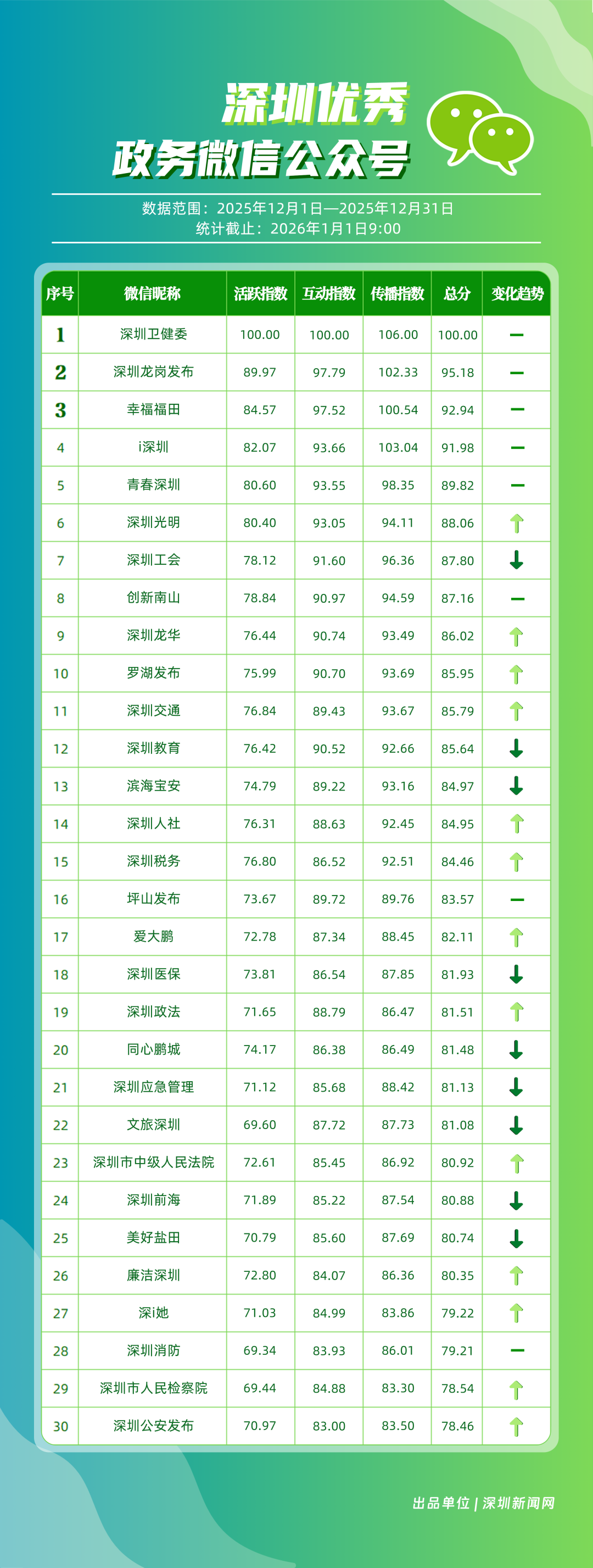 12月,“深圳衛(wèi)健委”“深圳龍崗發(fā)布”“幸福福田”“i深圳”“青春深圳”“深圳光明”“深圳工會”“創(chuàng)新南山”“深圳龍華”“羅湖發(fā)布”等30個政務(wù)微信公眾號榮登“深圳優(yōu)秀政務(wù)微信公眾號”榜單。12月榜單中,頭部政務(wù)賬號優(yōu)勢穩(wěn)固,腰部賬號競爭激烈。“深圳衛(wèi)健委”延續(xù)強勁表現(xiàn),在活躍、互動、傳播維度均斬獲滿分,60余篇文章閱讀超10萬,蟬聯(lián)榜首;“深圳龍崗發(fā)布”在互動、傳播方面表現(xiàn)亮眼,穩(wěn)居榜單第二;“幸福福田”也在互動、傳播方面具備一定優(yōu)勢,以穩(wěn)定的內(nèi)容輸出與用戶口碑,居于榜單第三?!吧钲诠饷鳌薄吧钲邶埲A”“羅湖發(fā)布”等政務(wù)賬號不斷拓展信息發(fā)布維度、深化服務(wù)場景打造,排名較上期有所提升。上榜微信公眾號以高質(zhì)量內(nèi)容為核心競爭力,在政務(wù)傳播賽道持續(xù)發(fā)力,為推動政務(wù)信息公開、服務(wù)民生需求搭建了高效的溝通橋梁。