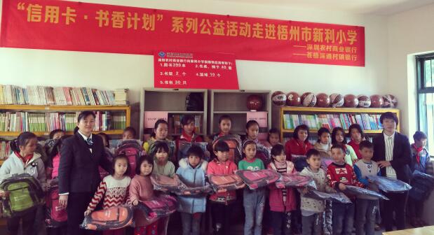 2016年,由深圳農(nóng)商行發(fā)起的“信用卡公益計劃·書香圖書室”捐贈活動,深入走進(jìn)廣西壯族自治區(qū)的偏遠(yuǎn)山區(qū),為當(dāng)?shù)剌^為貧困的學(xué)校學(xué)生送去溫暖。此次活動為當(dāng)?shù)氐闹写逍W(xué)、合林小學(xué)及龍降小學(xué)捐贈各類圖書共計2217本、文具6665套、書包153個、書桌書柜椅子共115個、體育用品108套,有效地幫助這三所小學(xué)建設(shè)完整的圖書室,為學(xué)生們創(chuàng)造良好的閱讀環(huán)境。[詳細(xì)]