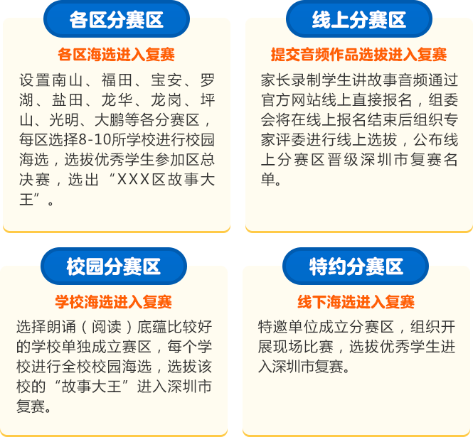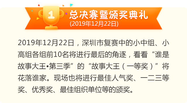 讓閱讀成為動人的風(fēng)景,讓故事的魅力感動深圳。為助力建設(shè)良好的青少年閱讀環(huán)境,激發(fā)學(xué)生閱讀興趣,倡導(dǎo)親子閱讀,共建和諧家庭關(guān)系。2020年,第二十一屆深圳讀書月主題活動“誰是故事大王·第四季”在共青團(tuán)深圳市委員會、深圳市關(guān)愛行動組委會辦公室的指導(dǎo)下再出發(fā)。更長的活動周期,更豐富的參與形式,更專業(yè)的賽制,“誰是故事大王·第四季”等你來解鎖與挑戰(zhàn)!